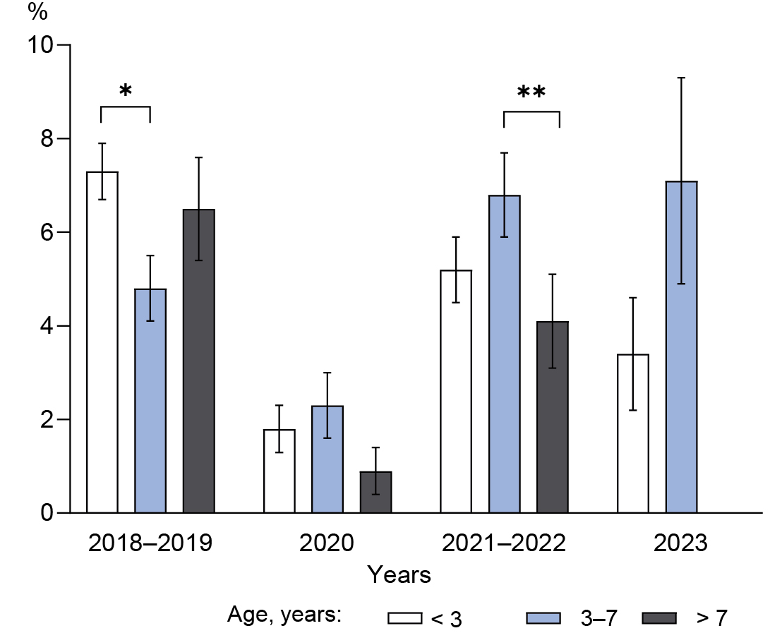 Children of all ages are susceptible to NPEV infection. At the same time, the frequency of EV detection in patients with AII differed in different age groups during the study period (Fig. 3). Thus, prior to the COVID-19 pandemic, EVs were significantly more frequently detected in children under 3 years of age (7.3 ± 0.6%; 120/1644; p = 0.006739), whereas in 2021-2022, EVs were most frequently detected in children aged 3-7 years (6.8 ± 0.9%; 53/778; p = 0.044991) compared to children older than 7 years. In 2020 and 2023, against a background of low detection rates of EVs in children with AII, no significant group differences were found, with no EVs detected in children over 7 years of age in the 2023 season, despite the fact that the number of children aged 7-17 years examined in 2022 and 2023 differed little (169 and 118, respectively).