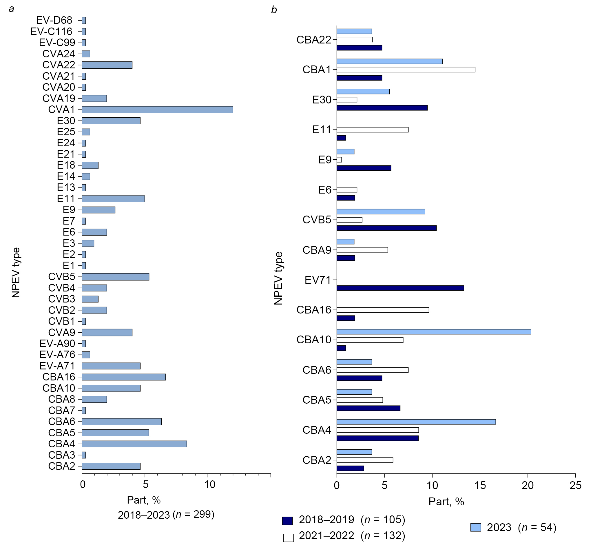 Fig. 4. Diversity of NPEV types identified in children with AII in 2018–2023 (а), before the pandemic (2018–2019), during the pandemic (2021–2022) and after its end (2023) (b).