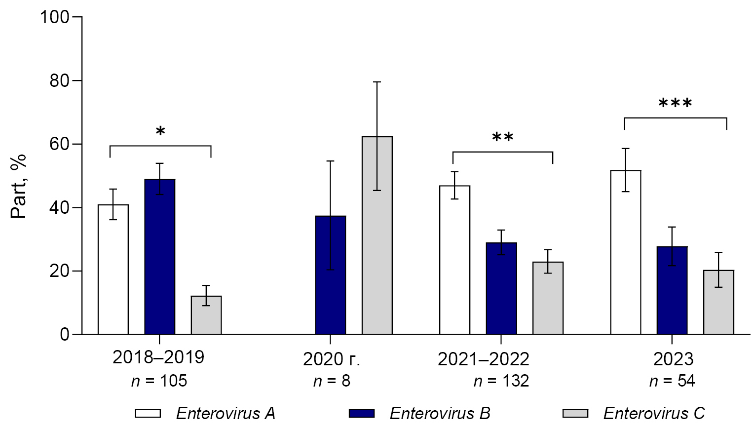 Fig. 5. Species distribution of NPEV isolated from children with AII in 2018–2023. *р = 0.000001; **р ≤ 0.002142; ***р ≤ 0.009897.