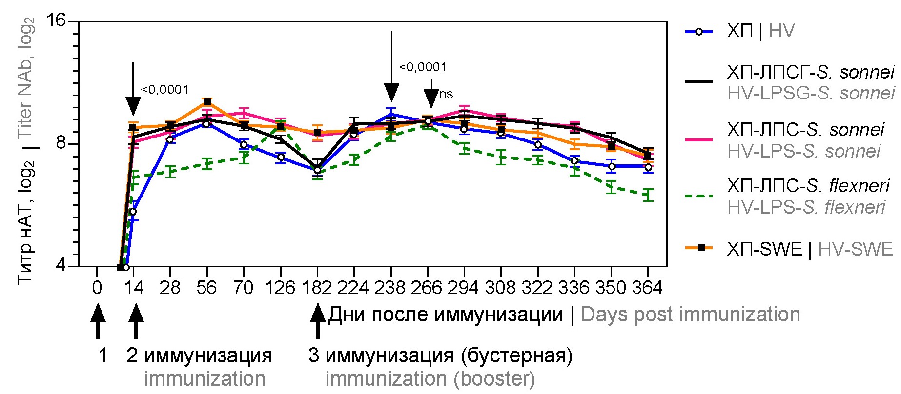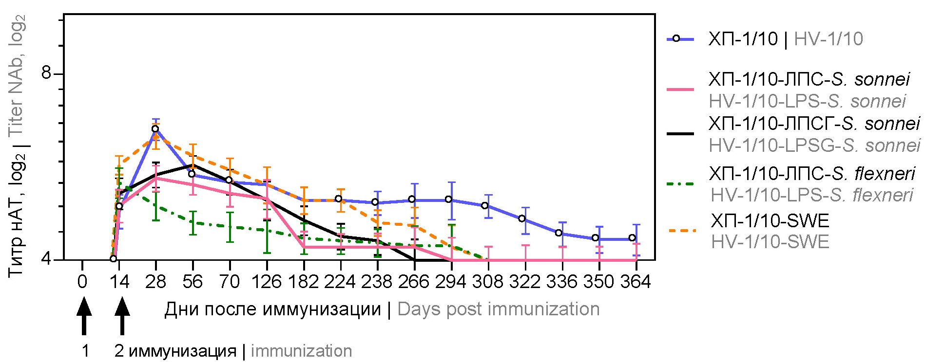 Менее выраженный иммунный ответ ХП-ЛПС-S. flexneri в концентрации 50 мкг/дозу выражался в более отдалённом формировании пика нАТ (к 126-му дню) в сравнении с ХП (на 56-й день). Для ХП-ЛПС-S. flexneri первичный ответ выражался в более значительном повышении уровня нАТ в сыворотке крови морских свинок по сравнению с нативным ХП после первой иммунизации. Бустерное введение препарата приводило к повышению уровня нАТ с формированием повторного пика на 266-й день.