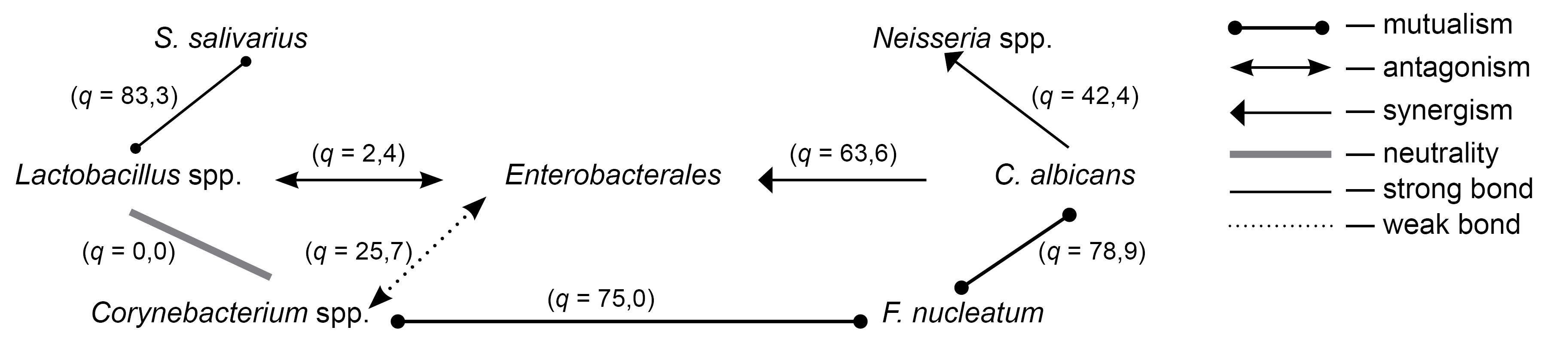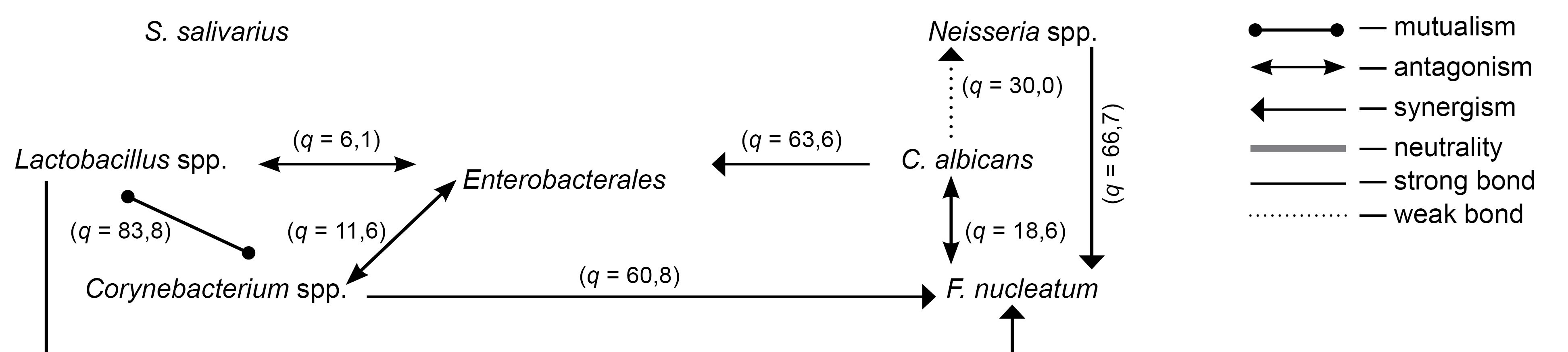 Synergism between Enterobacterales, fungi of the Candida genus and Neisseria spp. (q = 30–70) in group 2 patients persists and leads to the displacement of S salivarius. Furthermore, F. nucleatum forms more divergent relationships than strains of the same species isolated from group 1 patients. Thus, if in group 1 patients the neutrality between Fusobacterium spp. and Neisseria spp. was revealed, in group 2 patients these species show synergism (q = 66.7). The nature of relationships in the pair of Fusobacterium spp. and C. albicans changes in the case of inflammatory changes in the mucosa to antagonistic (q = 18.6), which, at first glance, does not seem logical, but is quite explainable by the fact that in antagonistic relationships between bacteria the spectrum of their metabolite changes, which is reflected in the clinical picture. Antagonistic relations between bacteria of the Enterobacterales order and the Lactobacillus genus are preserved in patients with and without clinical markers of inflammatory process.