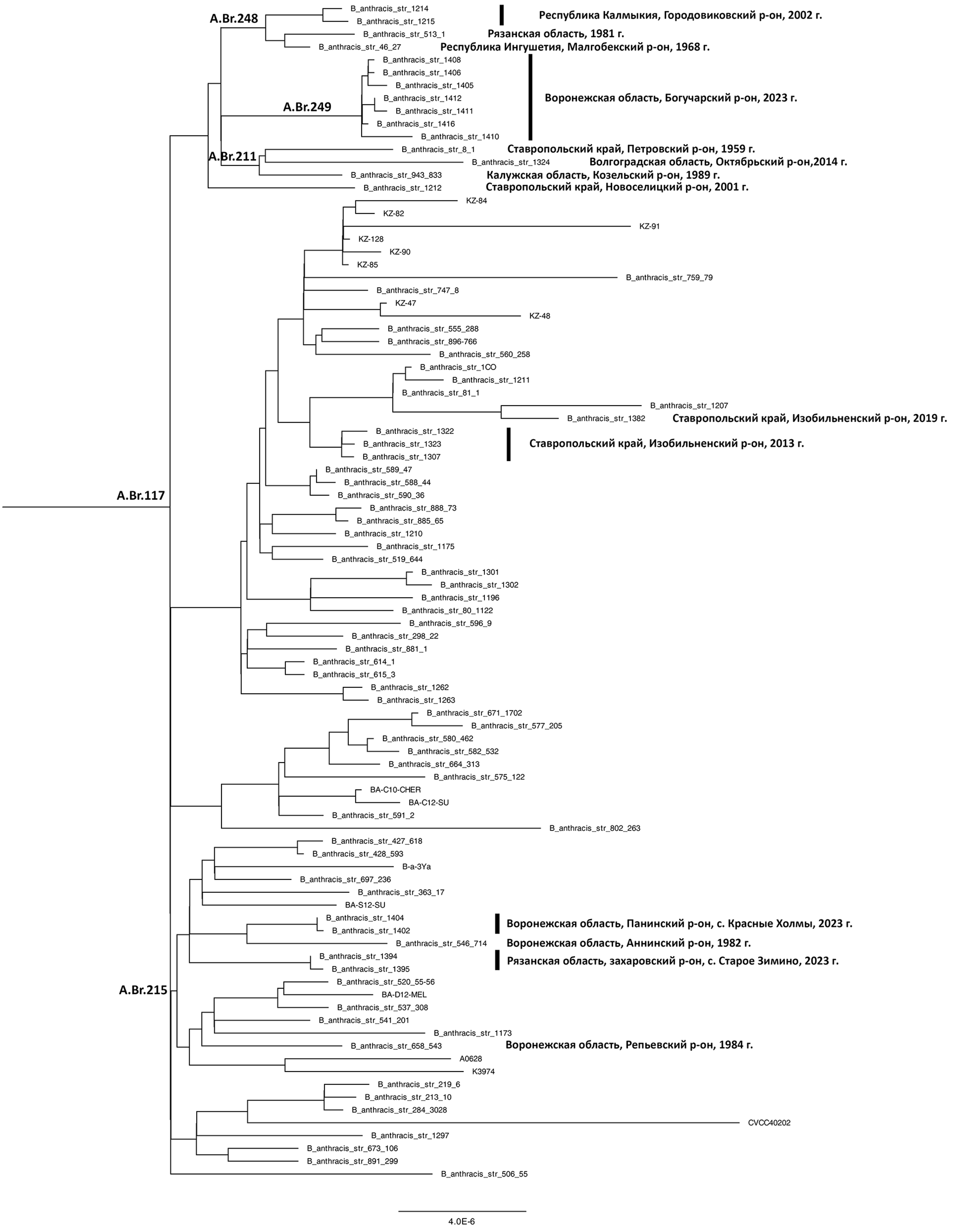 Cultures from the Paninsky district of Voronezh region and Zakharovsky district of Ryazan region belong to the A.Br.117 (Tsiankovskii) lineage, A.Br.215 cluster, and the strain isolated in the Anninsky district of Voronezh region in 1982 is the closest to them (Fig. 2).