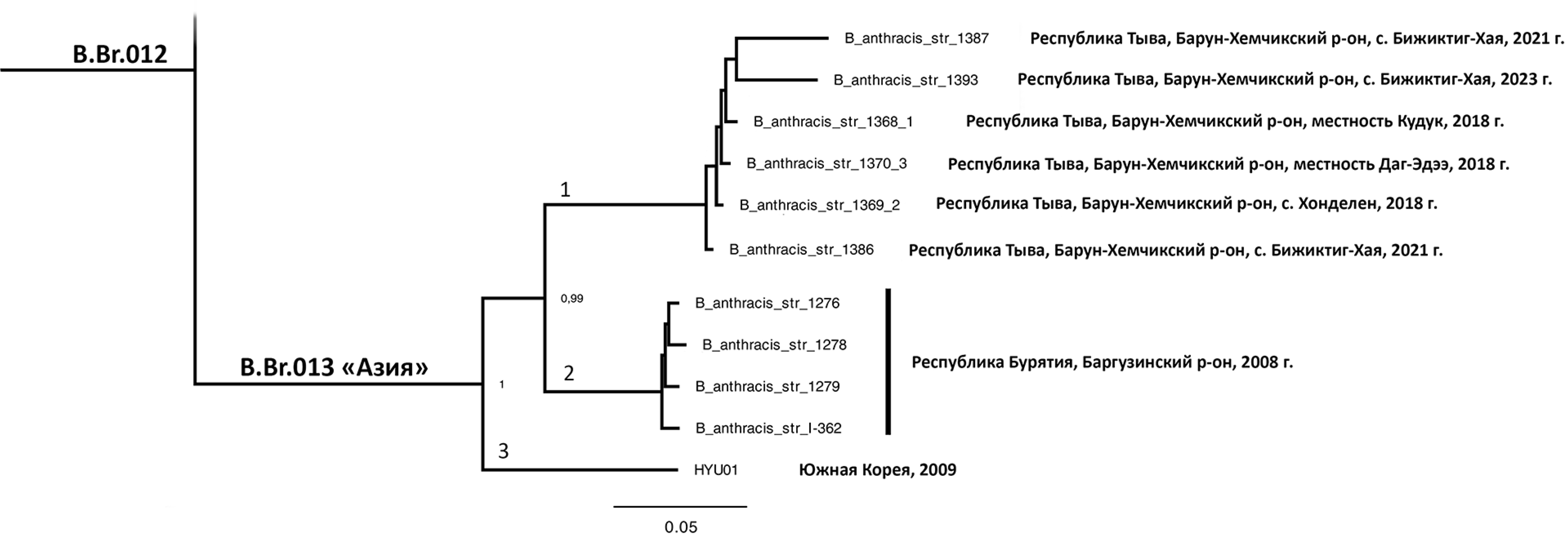The culture isolated in the Barun-Khemchik District of the Republic of Tyva belongs to the B.Br.013 Asia cluster of the B.Br.012 lineage and has a close phylogenetic relationship with strains isolated in the same region of the republic in 2018 and 2021 (subcluster 1 in Fig. 3).