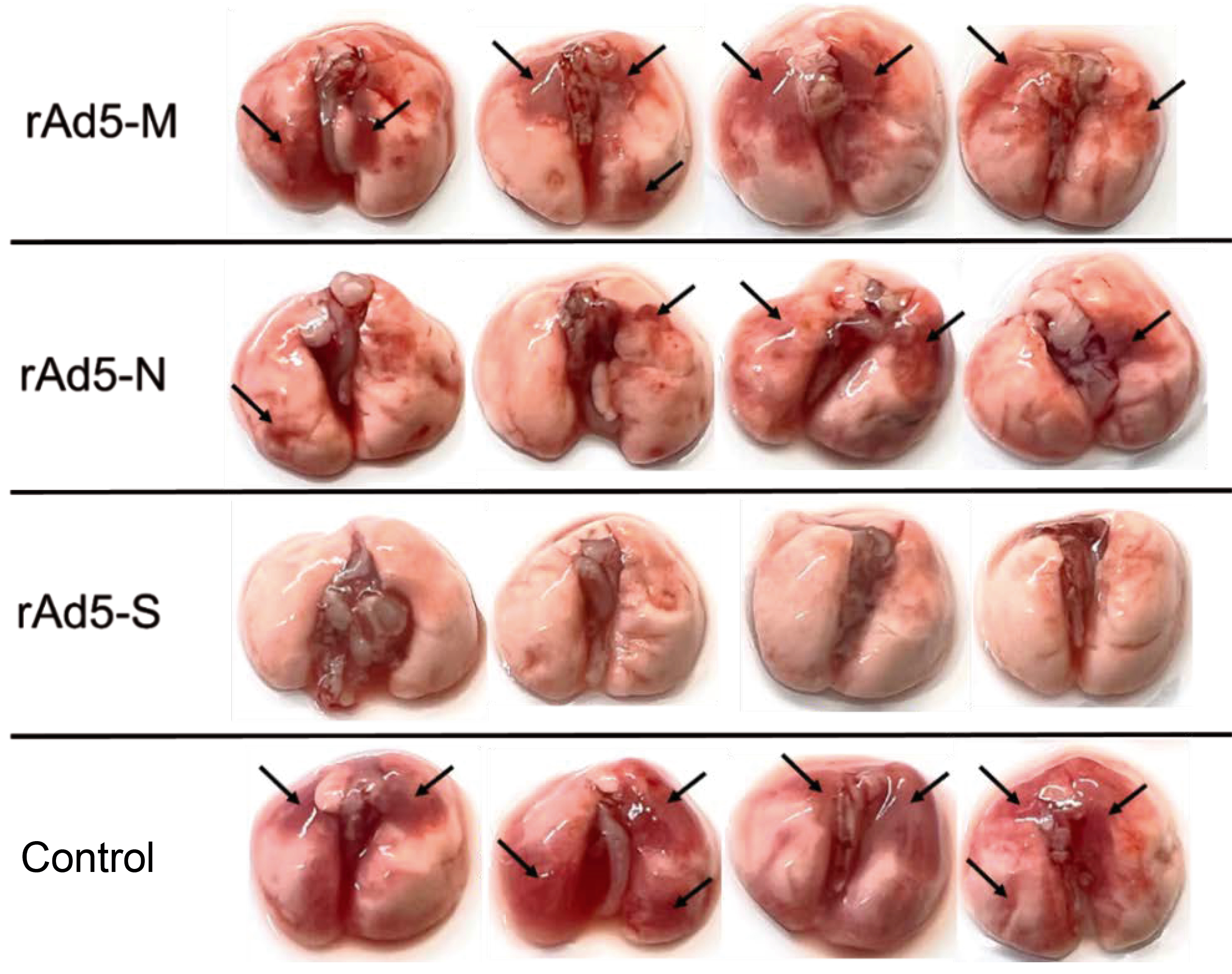 Fig. 2. Photographs of the lungs of hACE2-transgenic mice from the immunized and control groups (n = 4) on day 4 after infection with the SARS-CoV-2 virus. Arrows indicate areas of lung tissue damage.