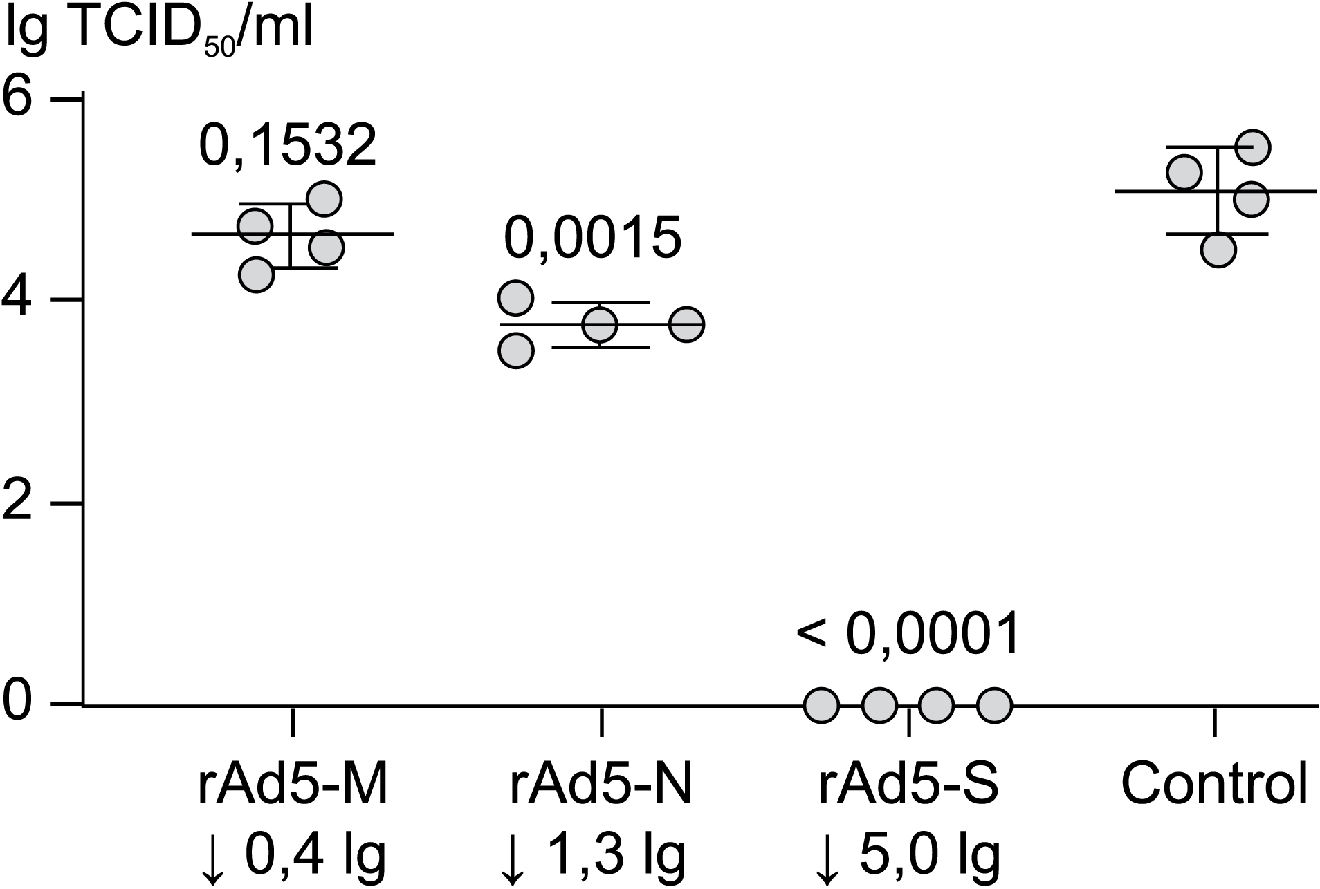 Fig. 3. Viral load in the lungs of hACE2-transgenic mice from the immunized and control groups (n = 4) on day 4 after infection with the SARS-CoV-2 virus.