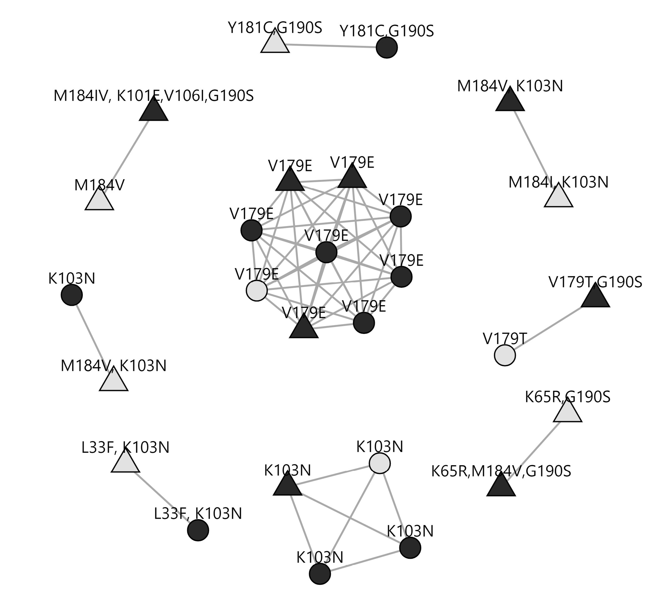 2. Fig. 4. Clusters with transmitted resistance mutations. The triangle indicates HIV-1 nucleotide sequences from ART-experienced patients, and the circle indicates HIV-1 nucleotide sequences from ART-naïve patients. HIV-1 nucleotide sequences from patients with the earliest date of diagnosis of HIV infection in the cluster are marked in light grey.