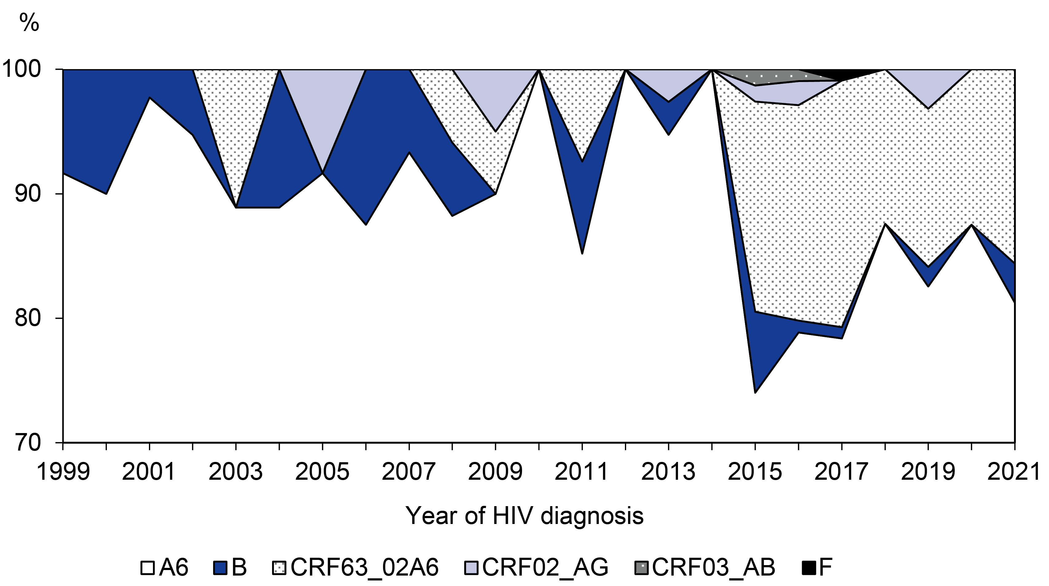 3. Fig. 1. Distribution of HIV-1 genetic variants by year of diagnosis of HIV infection.