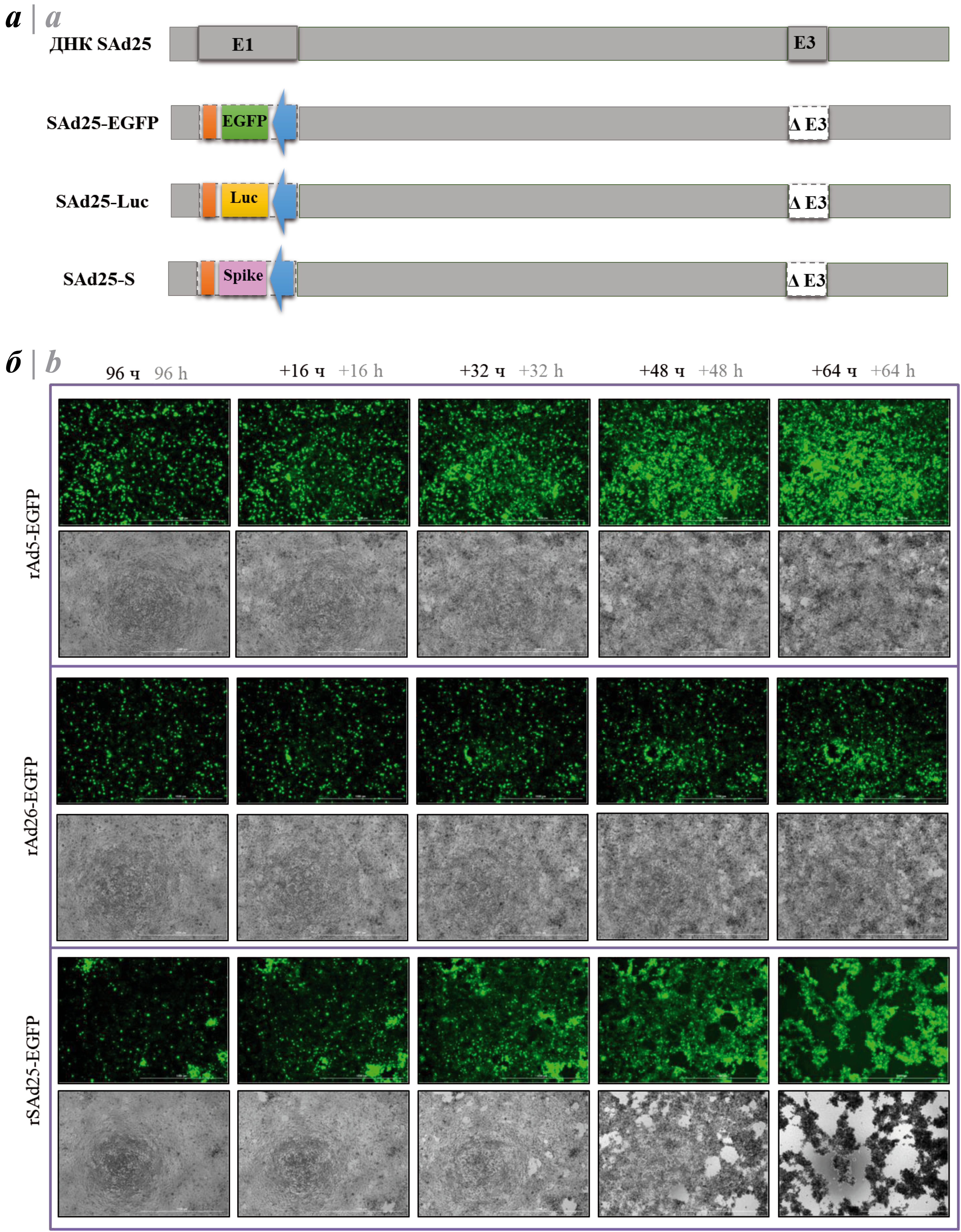 To evaluate the reproductive efficiency of the recombinant vector based on the simian adenovirus in permissive culture, rSAd25-EGFP carrying the gene of a fluorescent protein reporter was used. rAd5-EGFP and rAd26-EGFP carrying a similar transgene served as comparison vectors. HEK 293 cells were infected with the studied Ads at a rate of approximately 1 infectious particle per 100 cells. Visual evaluation of the results was performed starting 96 h after transduction every 16 h (Fig. 1, b).