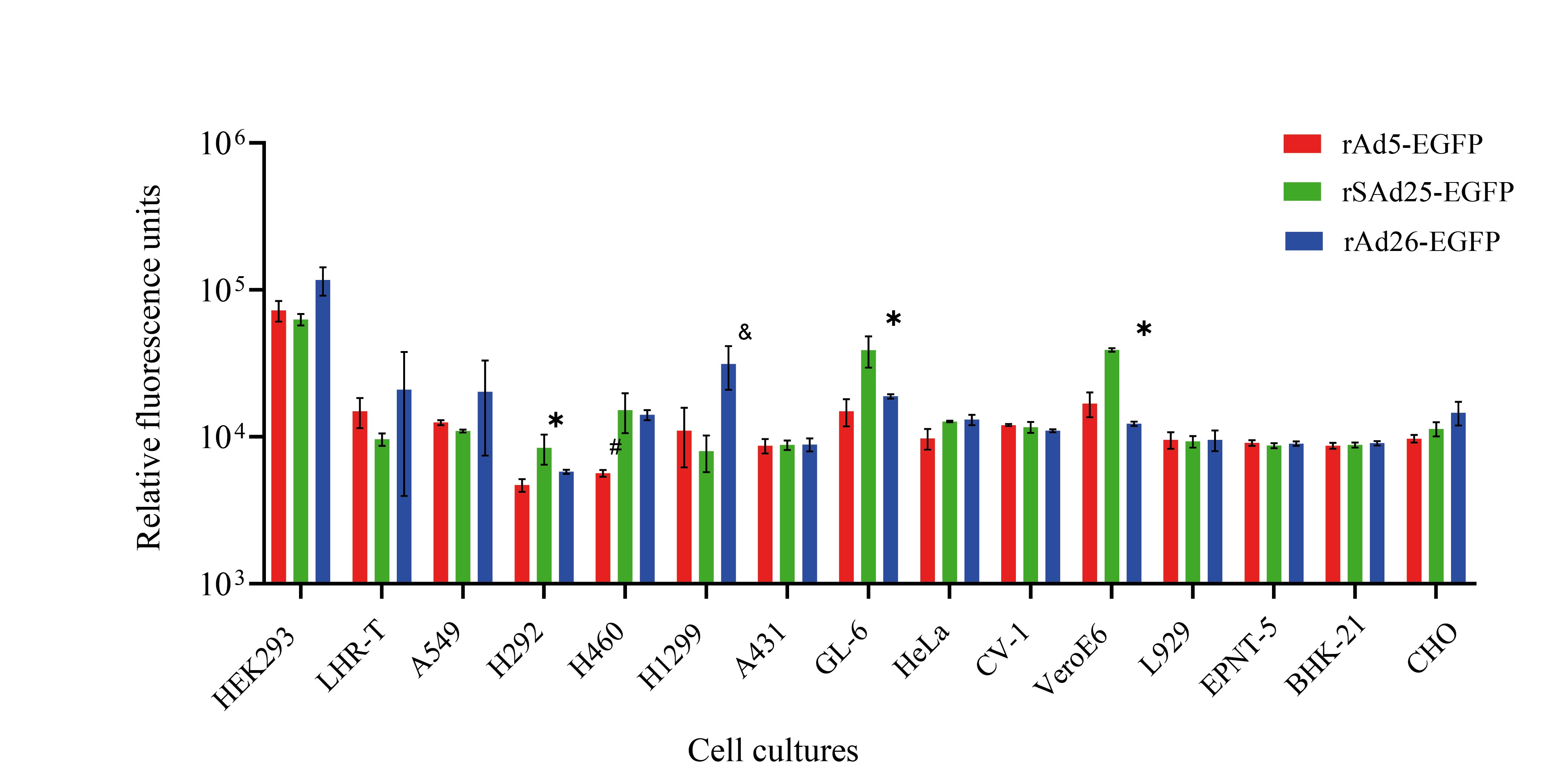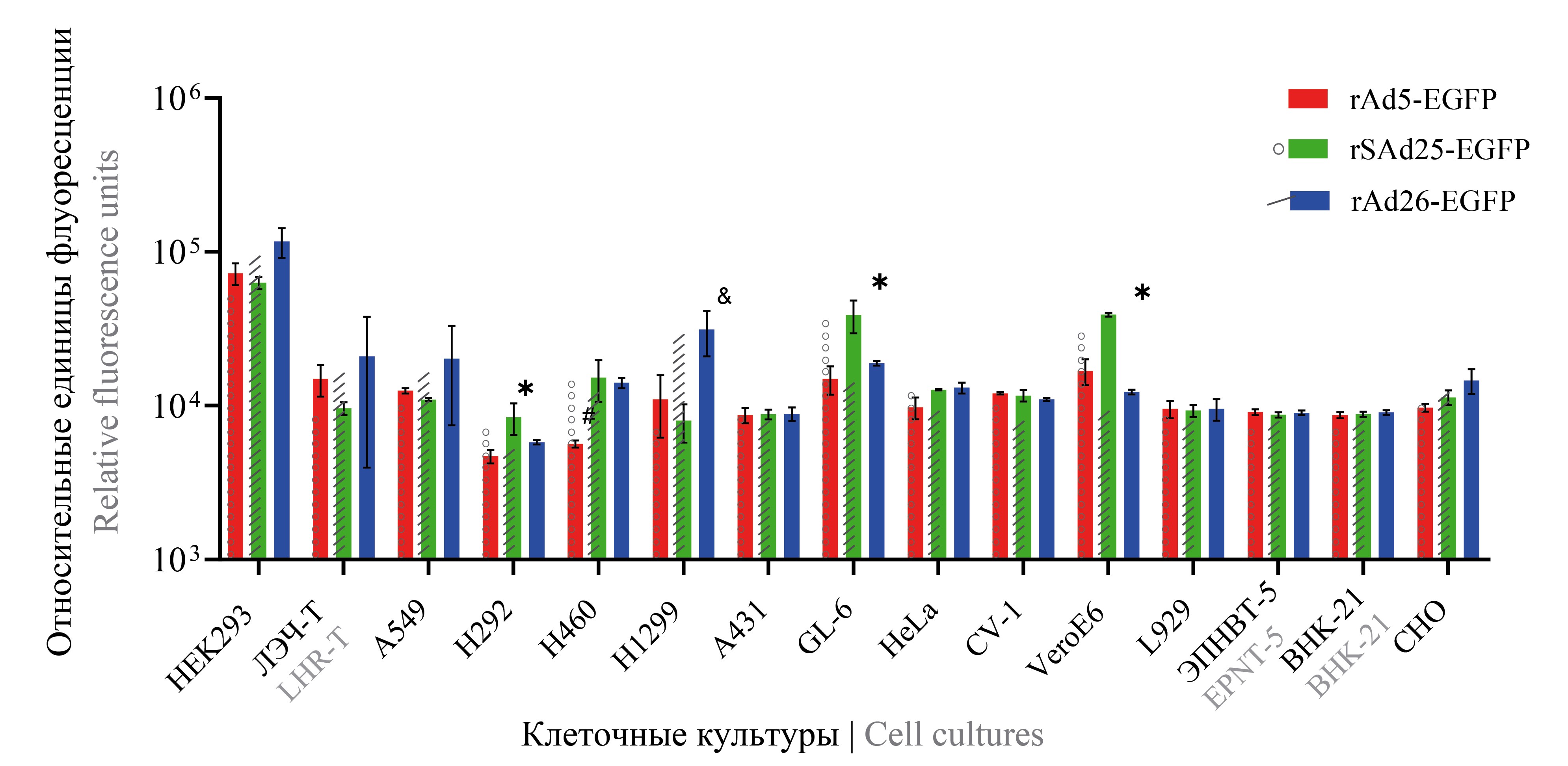 * — statistically significant difference with rSAd25-EGFP; & — statistically significant difference with rAd26-EGFP; # — statistically significant difference with rAd5-EGFP.