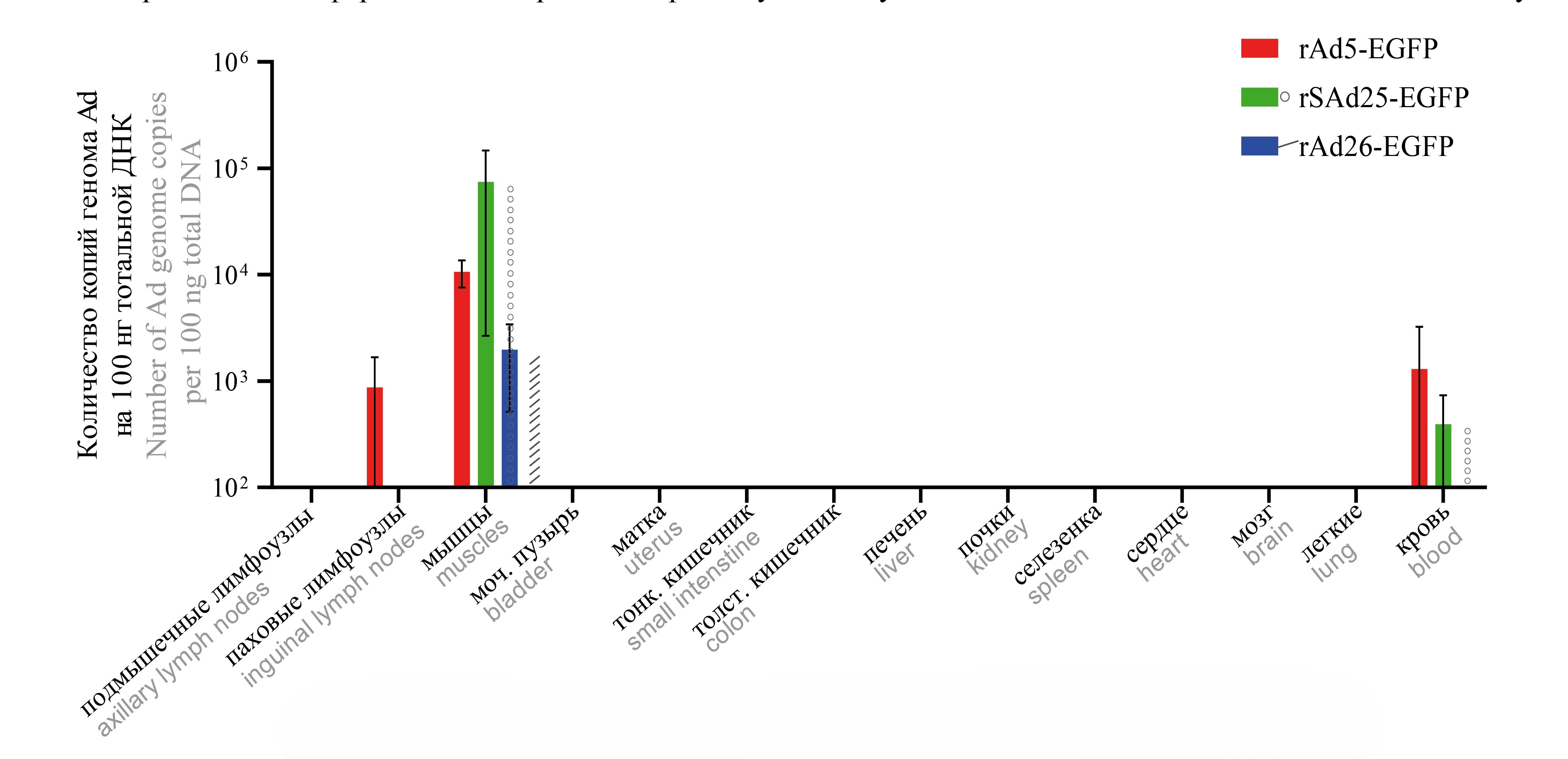 The biodistribution features of rAd5-EGFP, rAd26-EGFP and rSAd25-EGFP were studied in experiments on BALB/c mice using two methods: viral genome detection and transgene expression. 24 h after intramuscular injection of rAd at a dose of 1010 v.p., the number of Ad genome copies in tissues and organs was analyzed by real-time polymerase chain reaction (Fig. 3).