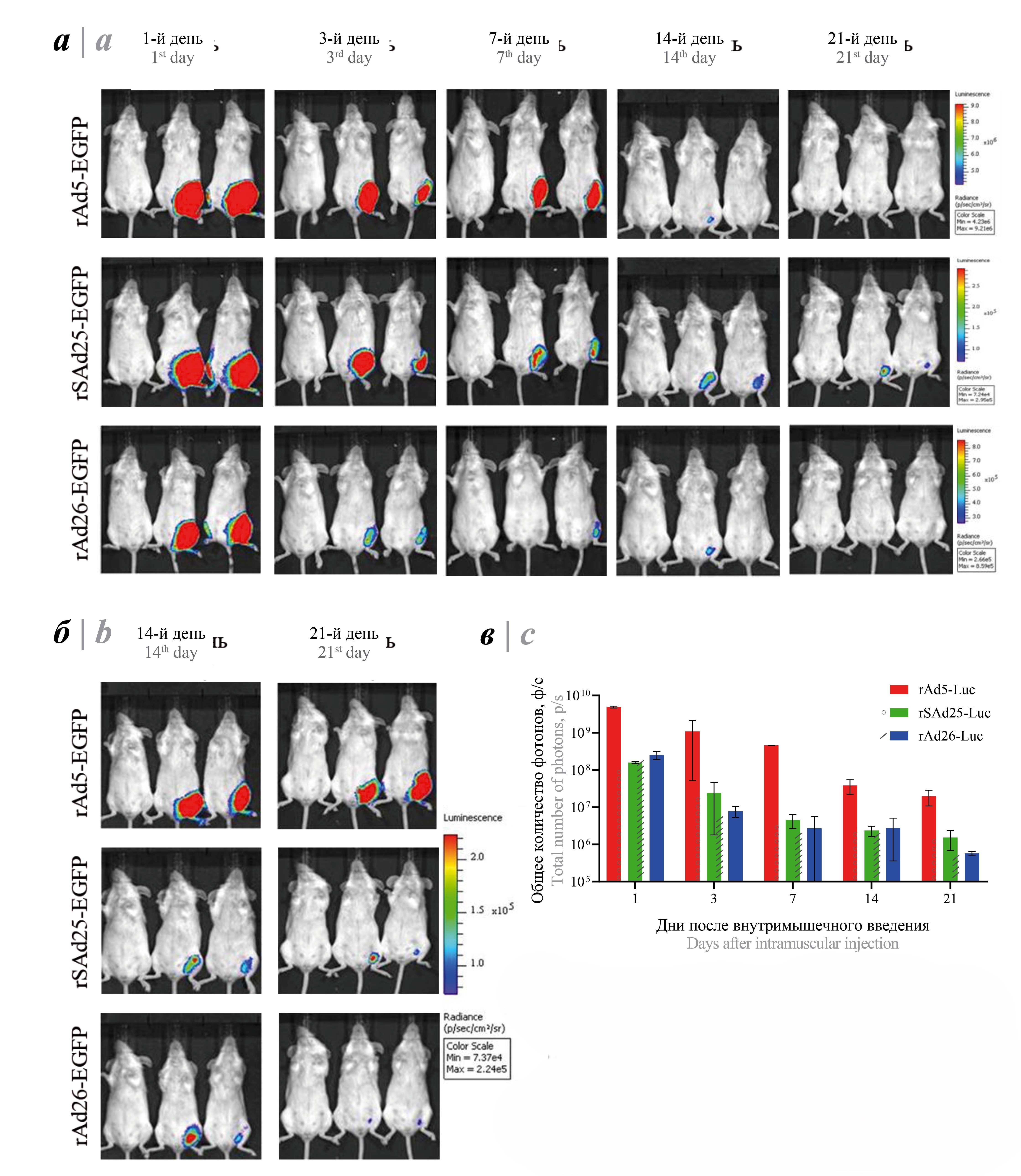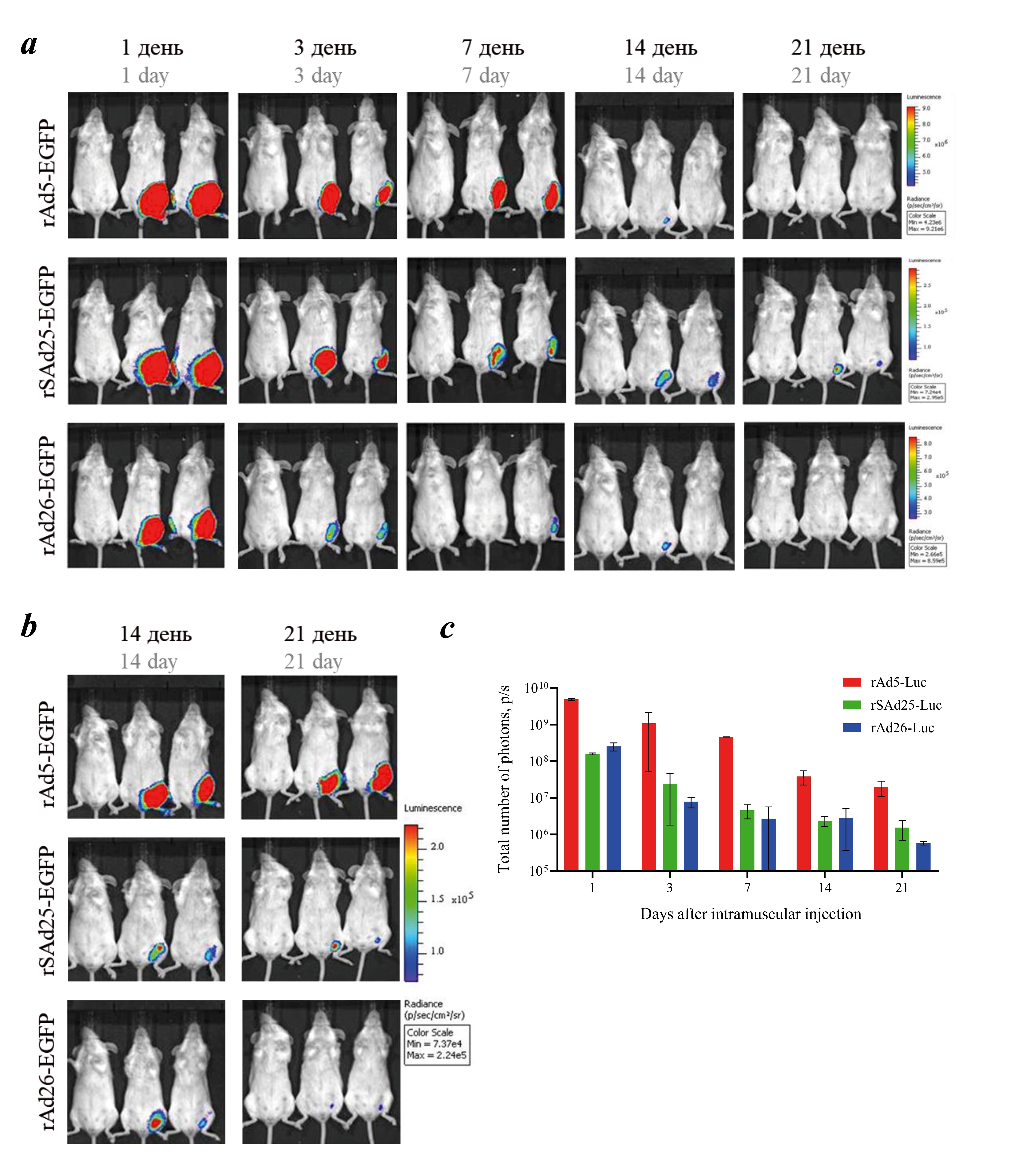 Fig. 4. Biodistribution of recombinant adenoviruses rAd5-Luc, rAd26-Luc, rSAd25-Luc in mice after intramuscular administration by bioluminescence imaging with averaged (a) and enhanced luminescence scale (b). c — photon flux measured in the luminescence region.