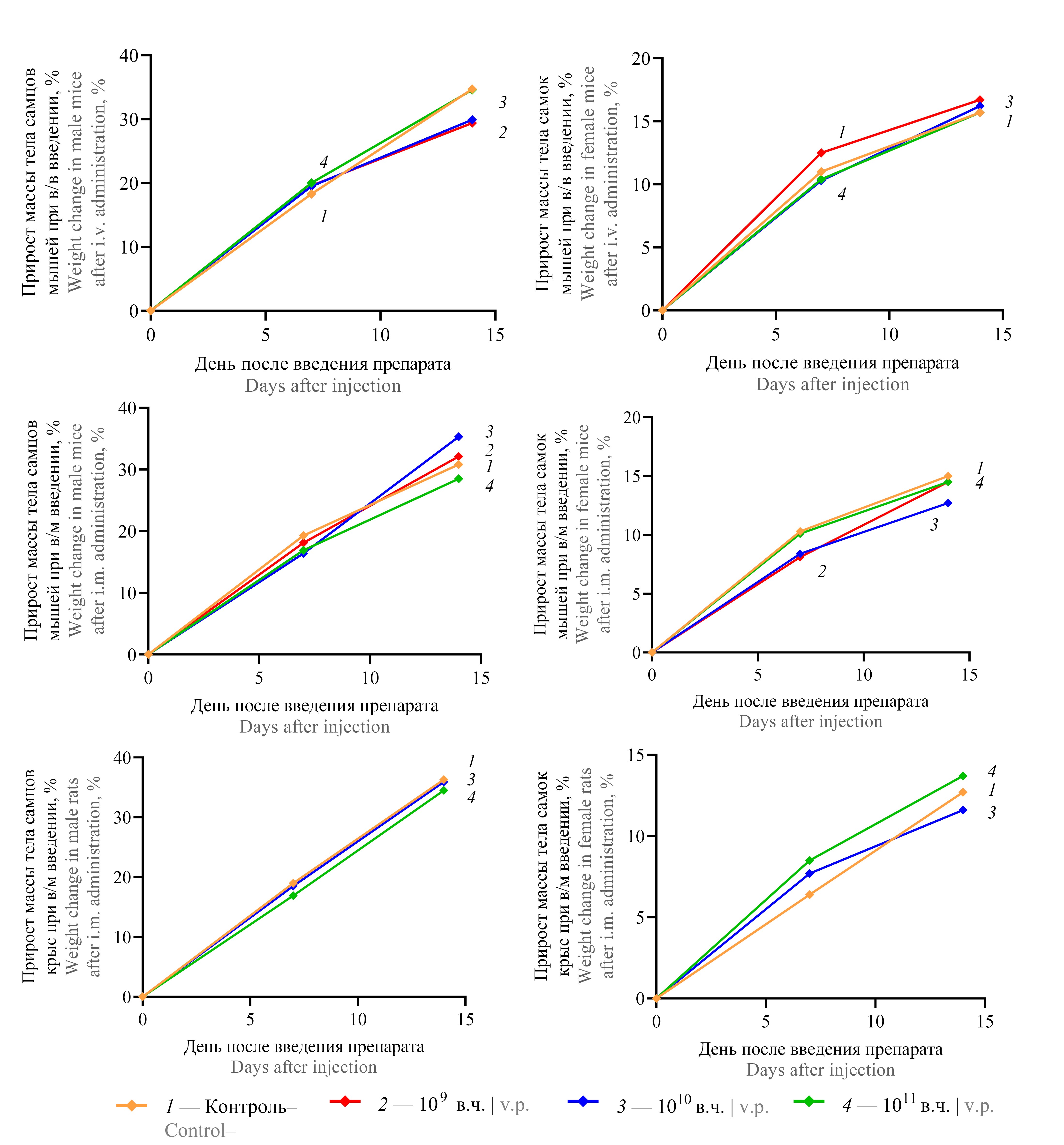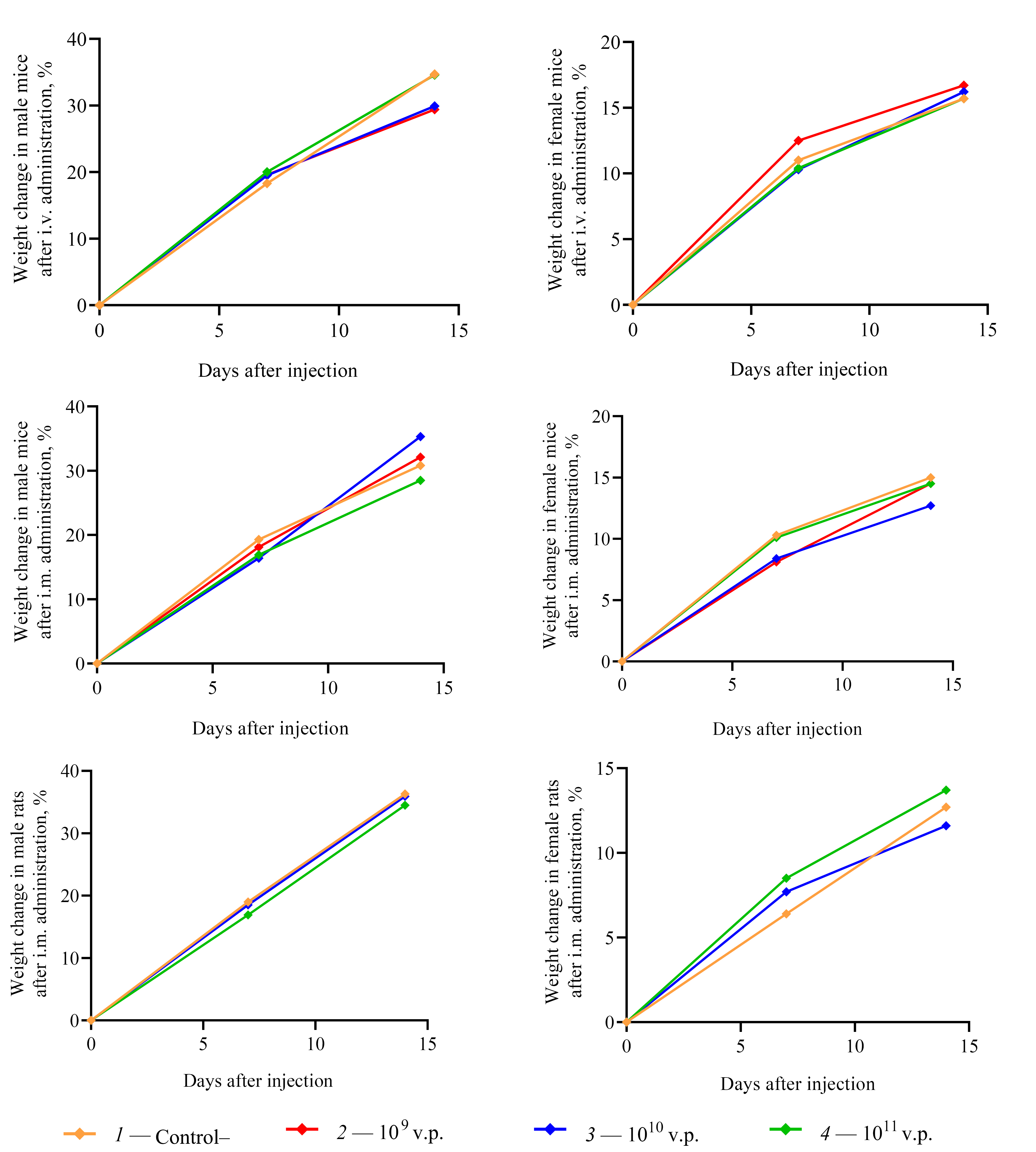 The tested animals (mice and rats) tolerated well both intramuscular and intravenous administration of adenovirus preparation in all doses. During the observation period, no animal died and no clinical signs of intoxication were observed. Integral indices of animal condition did not differ between experimental and control groups. Positive dynamics of body weight change was observed in all groups (Fig. 5).