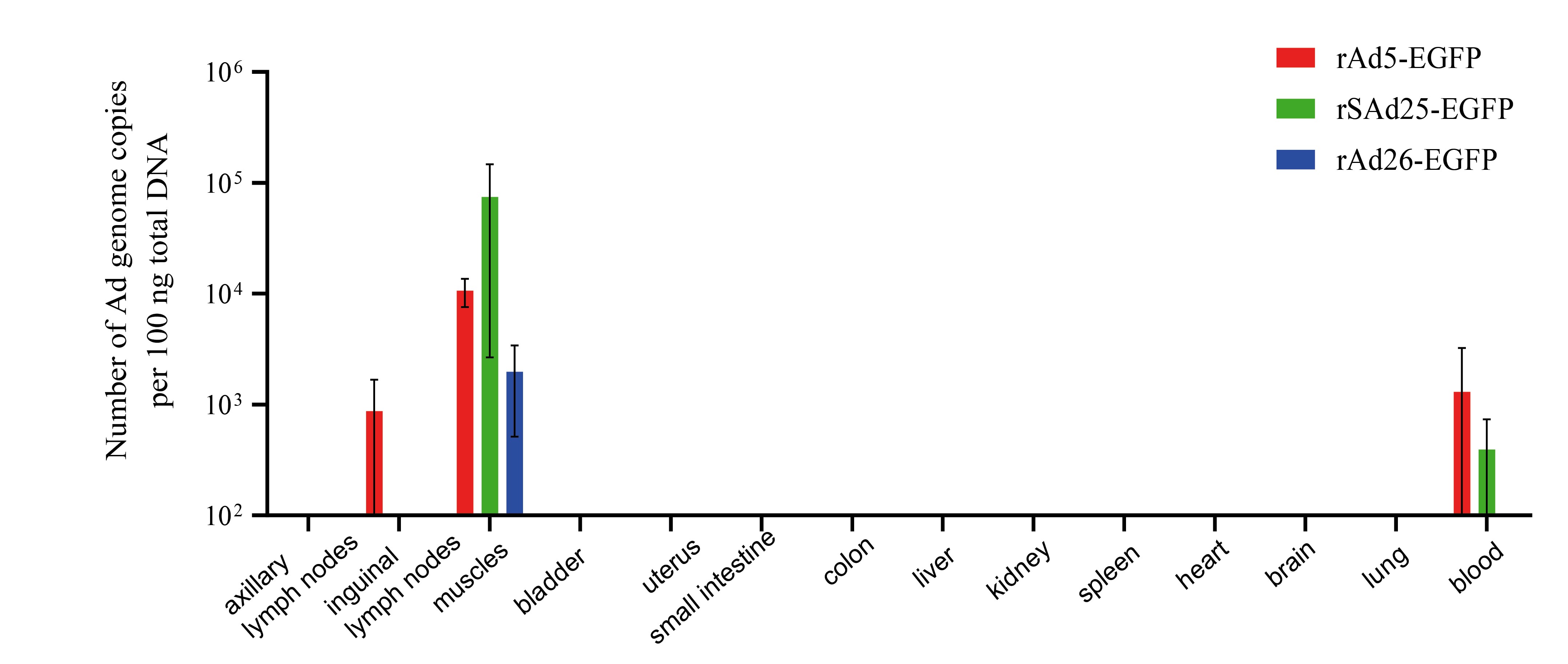 Among the 14 selected organs and tissues, viral DNA was mainly detected in muscle samples from the injection site. Moreover, the copy number of rSAd25-EGFP DNA in muscle was significantly higher than that of rAd26-EGFP and rAd5-EGFP DNA, respectively. In addition to the injection site, small amounts of rAd5 genomes were detected in the lower lymph nodes as well as in the blood (rSAd25 and rAd5).