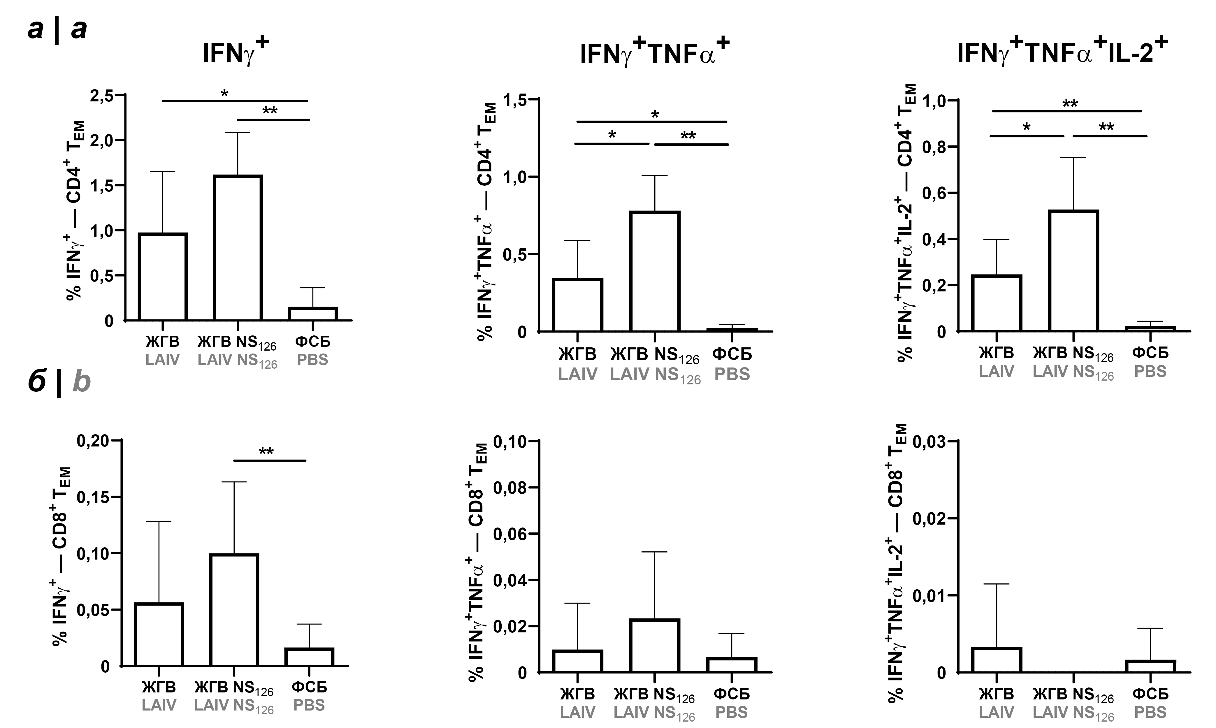 Two-dose immunization of mice with LAIV and LAIV with truncated NS126 stimulated the induction of high levels of virus-specific TEM cells with CD44+CD62L- phenotype in the spleens of mice, and truncation of NS1 protein in the vaccine strain of LAIV significantly increased the levels of polyfunctional CD4+-TEM cells secreting two (IFN-γ, TNF-α) or three (IFN-γ, TNF-α and IL-2) cytokines simultaneously (Fig. 1, а). Furthermore, only the group of mice that received LAIV NS126 showed significantly higher levels of IFN-γ-producing cytotoxic memory T cells compared to controls (Fig. 1, b). Thus, the data obtained indicate that the modified strain of LAIV NS126 may have a higher potential for protection against influenza infection than the classical LAIV variant.
