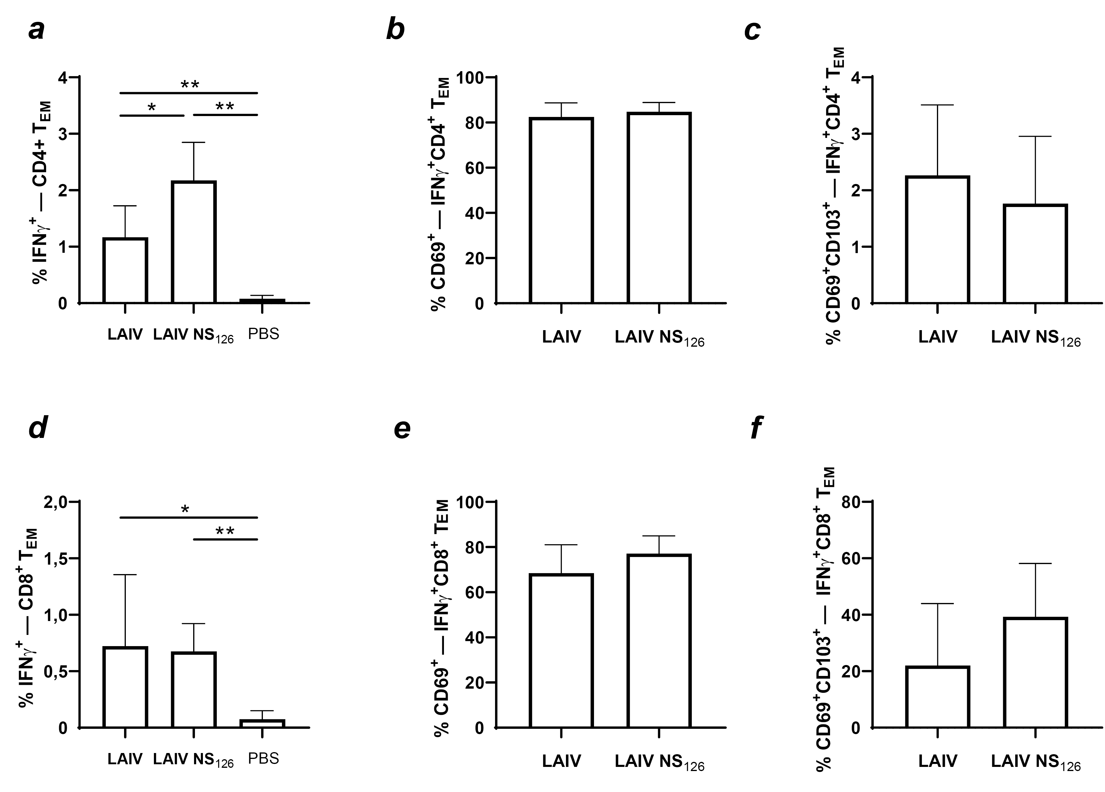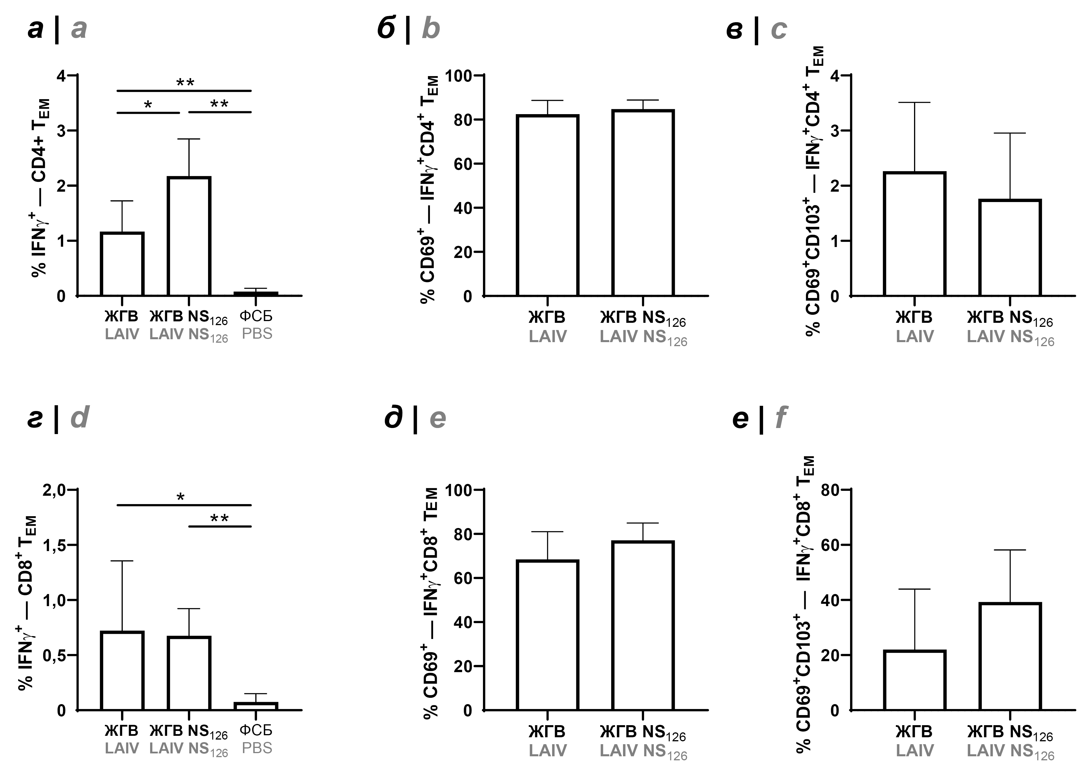 Further, we investigated subpopulations of virus-specific TEM cells in the lungs with evaluation of the expression of surface markers of memory TRM cells by these cells. Evaluation of the levels of IFN-γ-producing TEM cells in the lungs of immunized mice revealed a significant enhancement of the CD4+ T-cell response in the group of animals inoculated with the prototype LAIV NS1126 compared with the classical version of the vaccine (Fig. 2, a). For cytotoxic CD8+-TEM cells in the lungs, a comparable level of immunogenicity of LAIV was shown, independent of NS1 protein modification (Fig. 2, d). At the same time, the level of expression of tissue residency markers was comparable in both vaccine groups (Fig. 2, b, c, d, e, f), indicating the localization of the identified virus-specific cells in the lung epithelium, in close proximity to the potential site of pathogen entry.