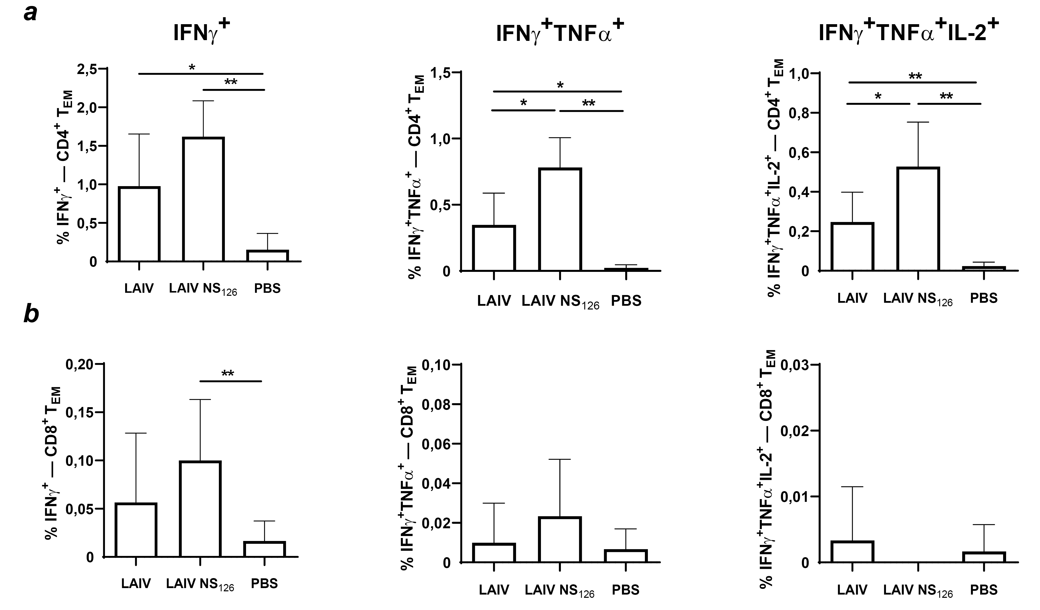 Fig. 1. Number of effector memory T cells (CD44+CD62L–) with CD4+ (a) and CD8+ (b) phenotype expressing IFNγ (left panel), IFNγ and TNFα (middle panel) and IFNγ, TNFα and IL-2 (right panel) in groups of mice immunized with LAIV or LAIV with truncated NS1 protein, as well as in the control group (PBS).