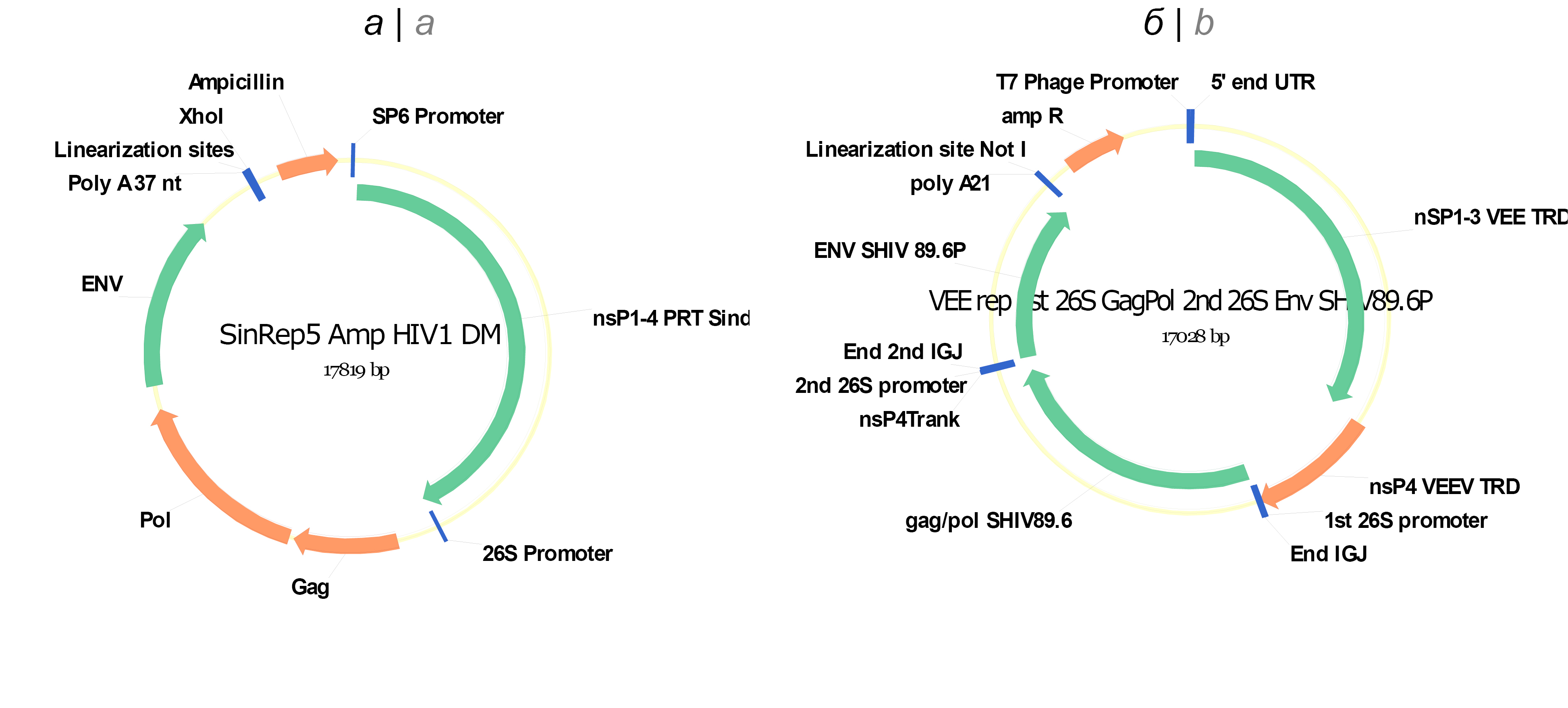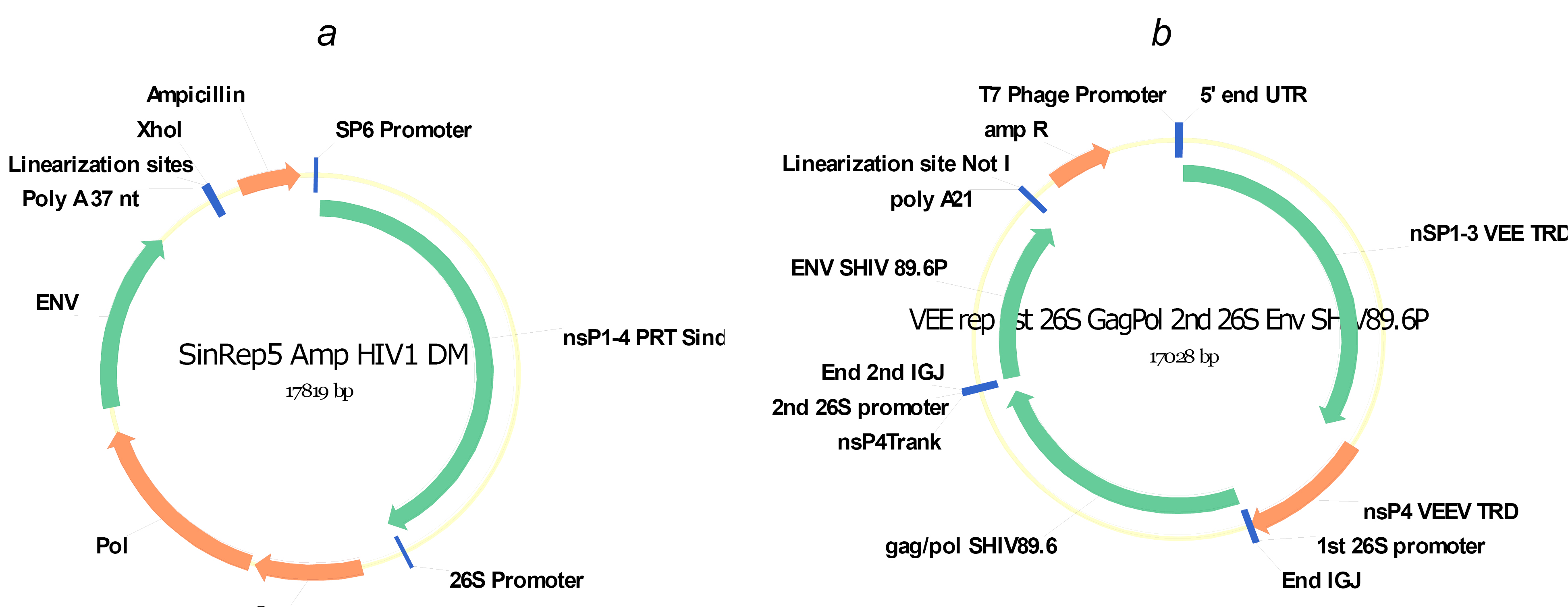 DNA sequences encoding Gag/Pol and Env gp160 proteins of lentiviruses (HIV-1B and SHIV89.6P) were obtained by standard genetic engineering methods. A plasmid containing DNA encoding HIV-1B proteins was constructed on the Sindbis virus replicon platform (Fig. 1, a). A plasmid containing DNA encoding SHIV89.6P proteins on the VEEV replicon platform was constructed from the SHIV89.6P KB9 molecular clone (GenBank # U89134) (Fig. 1, b).