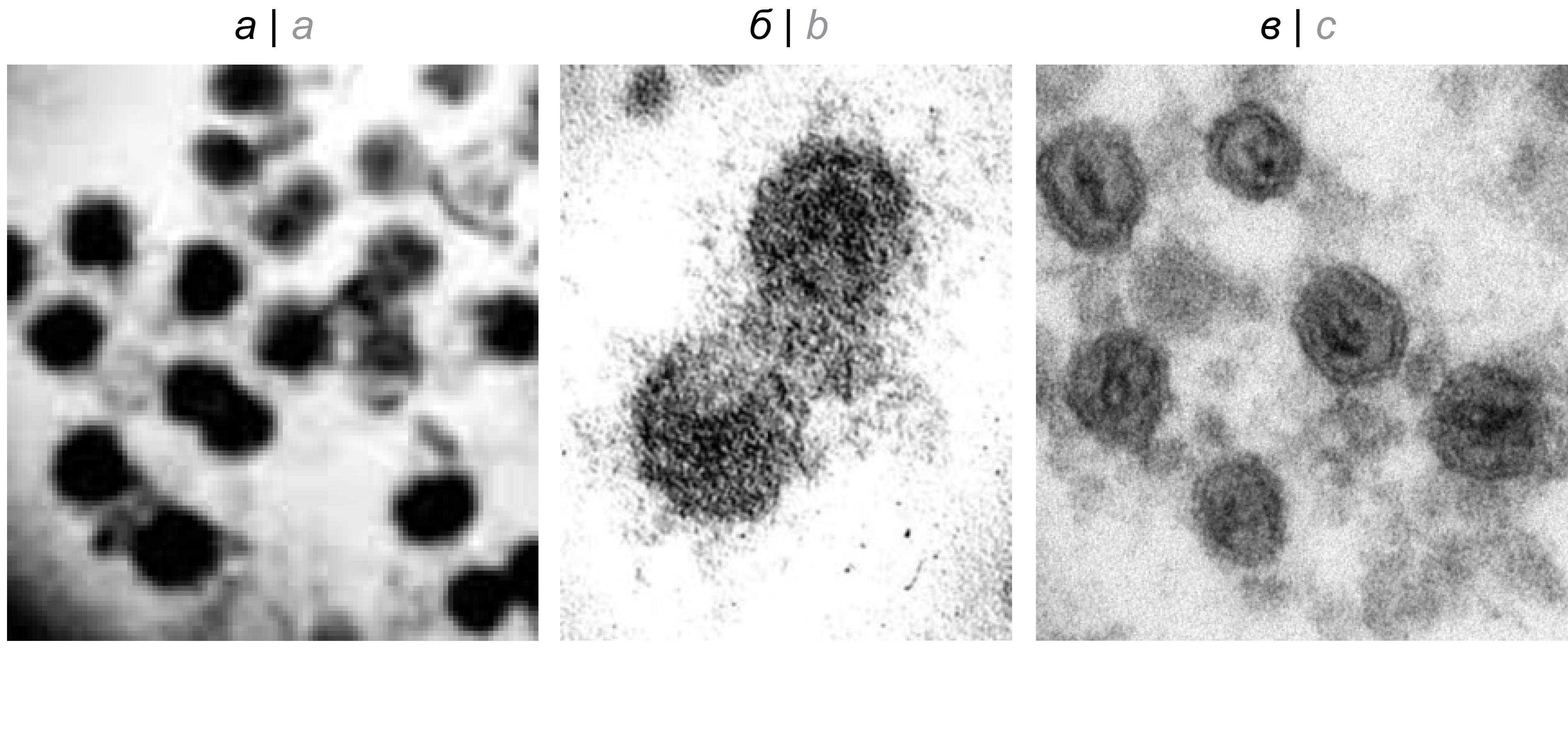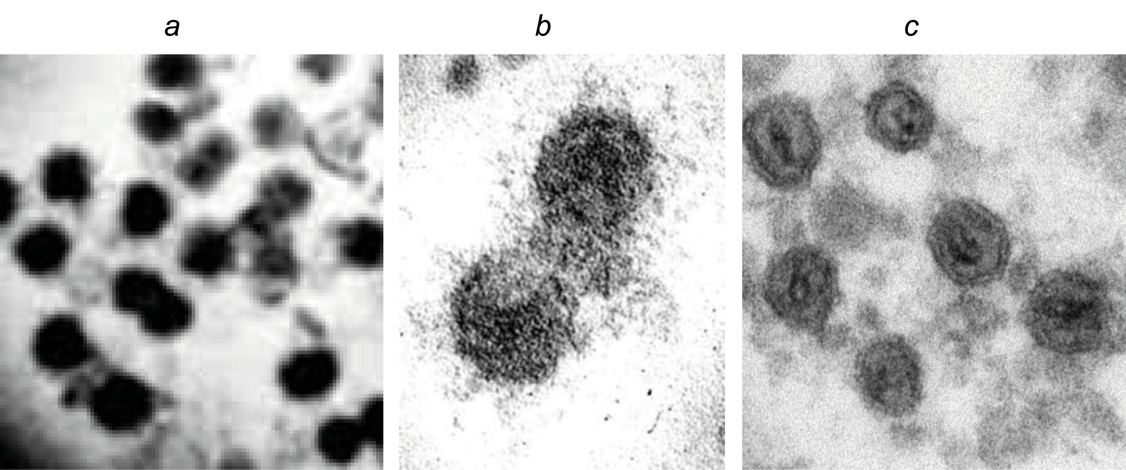 3. Fig. 2. Electron microscopic photographs of lentiviral VLPs. a and b — HIV-1B VLPs; c — VLP SHIV89.6P VLPs.
