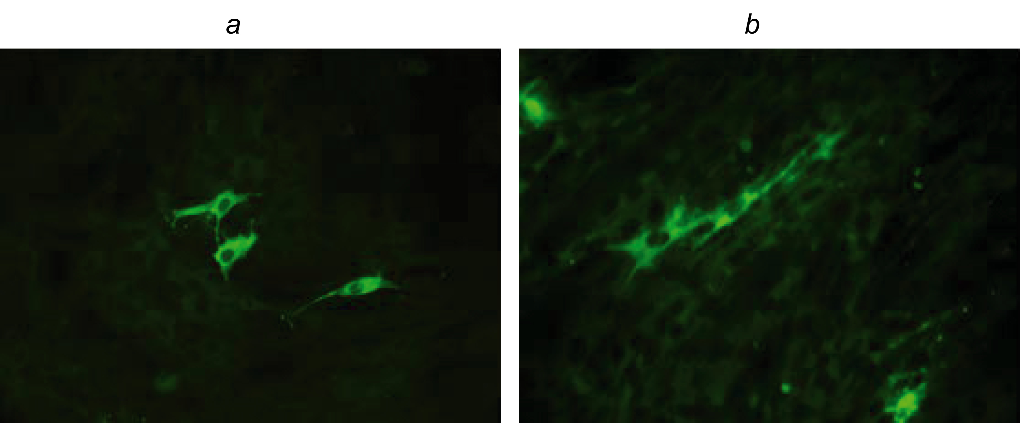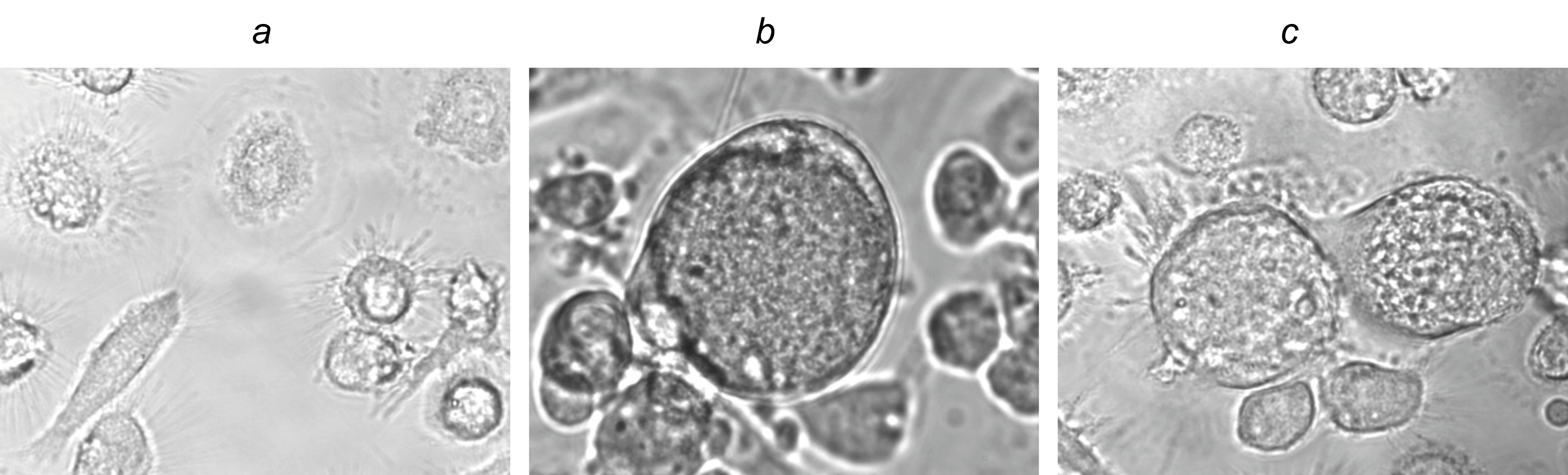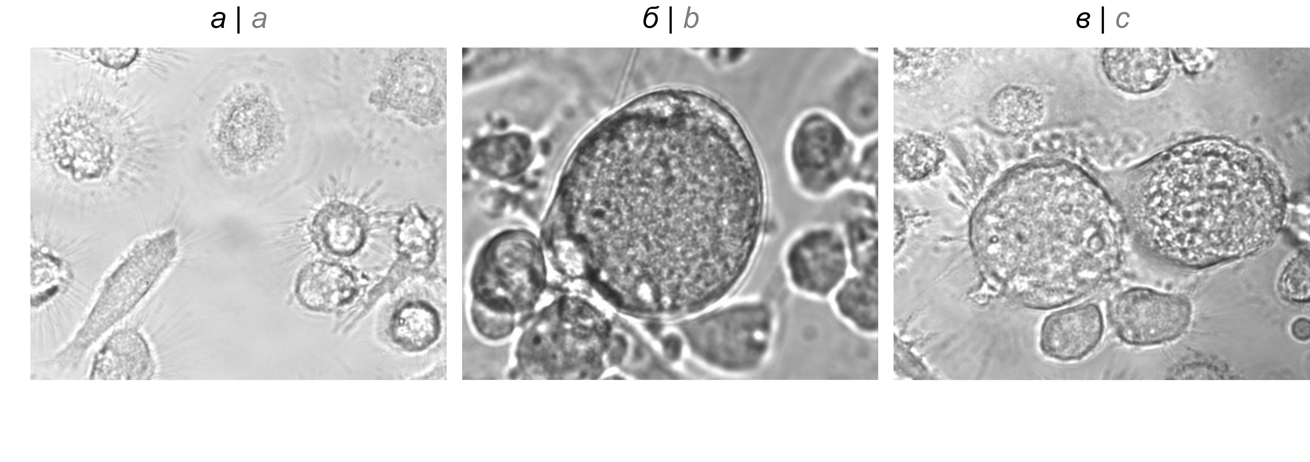 5. Fig. 4. Formation of syncytium on human macrophages infected with lentivirus recVLPs. a — negative control, ×20; b, c — formed syncytium, ×40: HIV-1B recVLPs (b) and SHIV89.6P recVLPs (c).