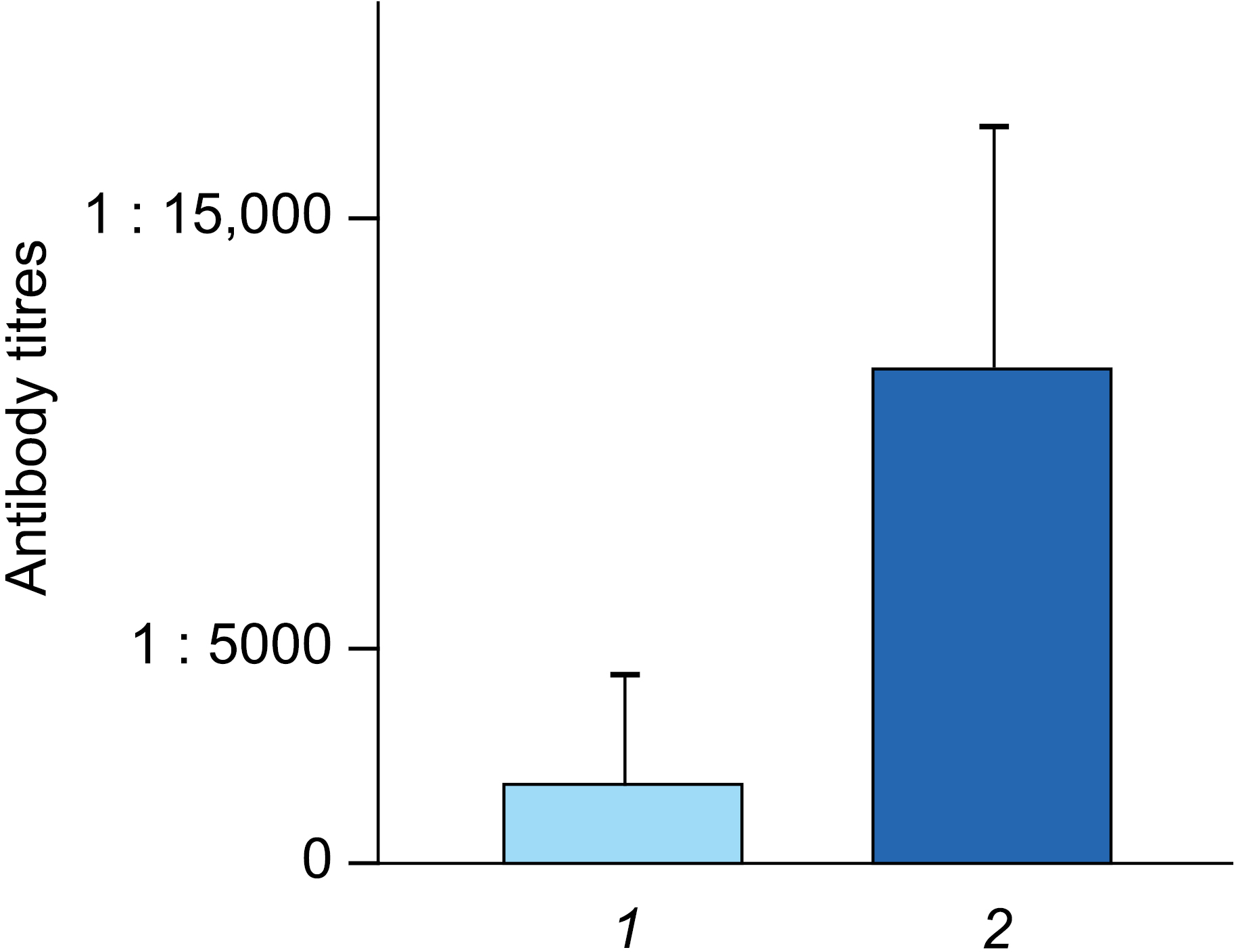 Two intraperitoneal immunizations of 10 laboratory mice with an interval of 2 weeks and subsequent obtaining of blood serum 3 weeks after the second immunization at a dose of 10 µg (0.5 ml) resulted in the formation of antibodies against NV VP1 in the blood of animals. Antibodies in the blood of animals were detected in titers from 1 : 1024 to 1 : 4096, the average titer was 1 : 1536. Immunization of animals with the same dose of protein according to the same scheme, but mixed with 100 mg of aluminum hydroxide caused the appearance of antibodies against NV VP1 in titers up to 1 : 32,768. On average, the antibodies titer was 1 : 13,720, which was almost an order of magnitude higher than the antibodies titers in animals immunized without aluminum hydroxide (Fig. 3). Thus, it was shown that the obtained recombinant protein is able to induce a pronounced antisense response, which significantly increases in the presence of the used adjuvant.