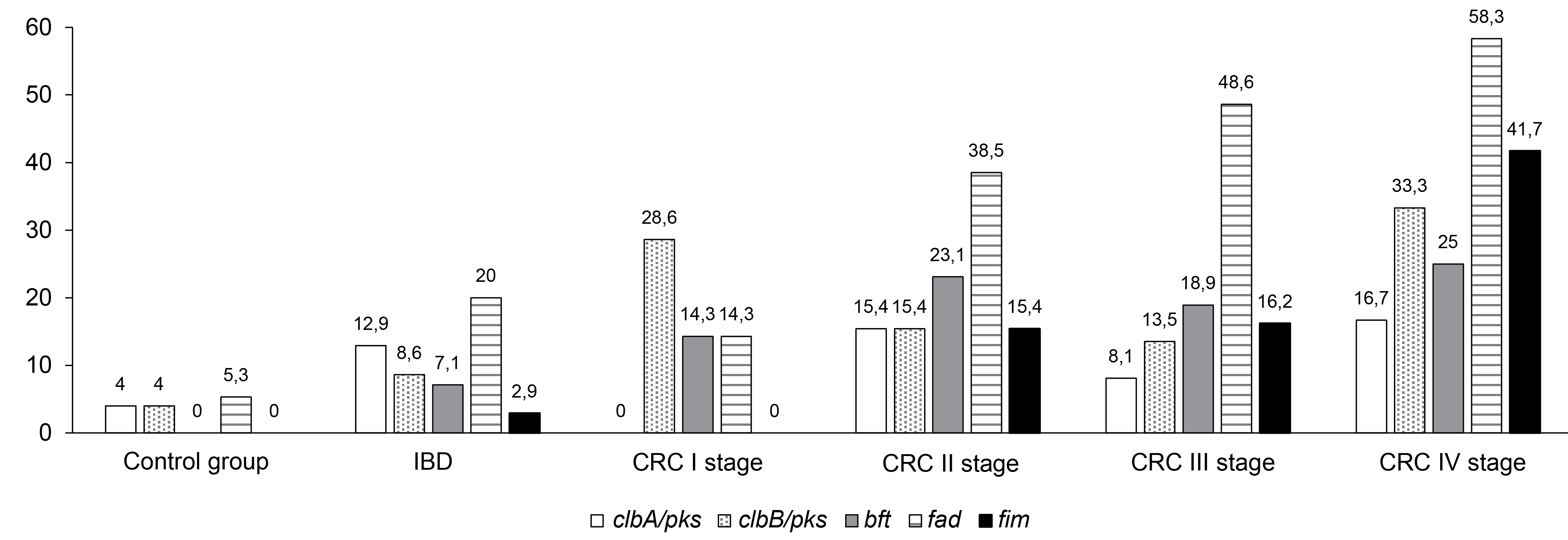 Materials and methods. 215 participants were included in the "case–control" study: 70 patients with newly diagnosed colorectal cancer, 70 patients with inflammatory bowel disease, 75 participants without diagnosed intestinal pathology. Polymerase chain reaction (PCR) was used to identify and detect genes of potentially oncogenic microorganisms.