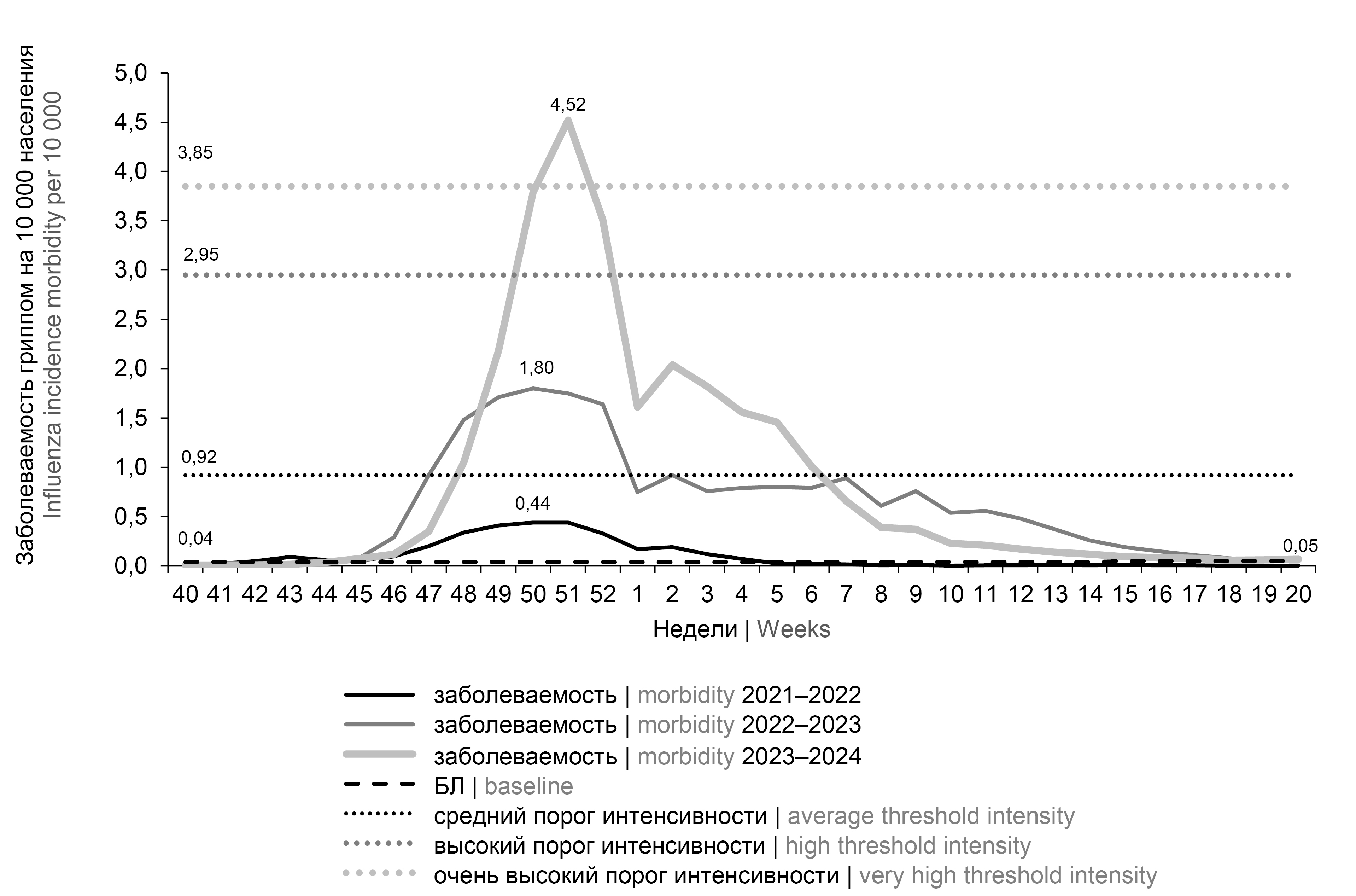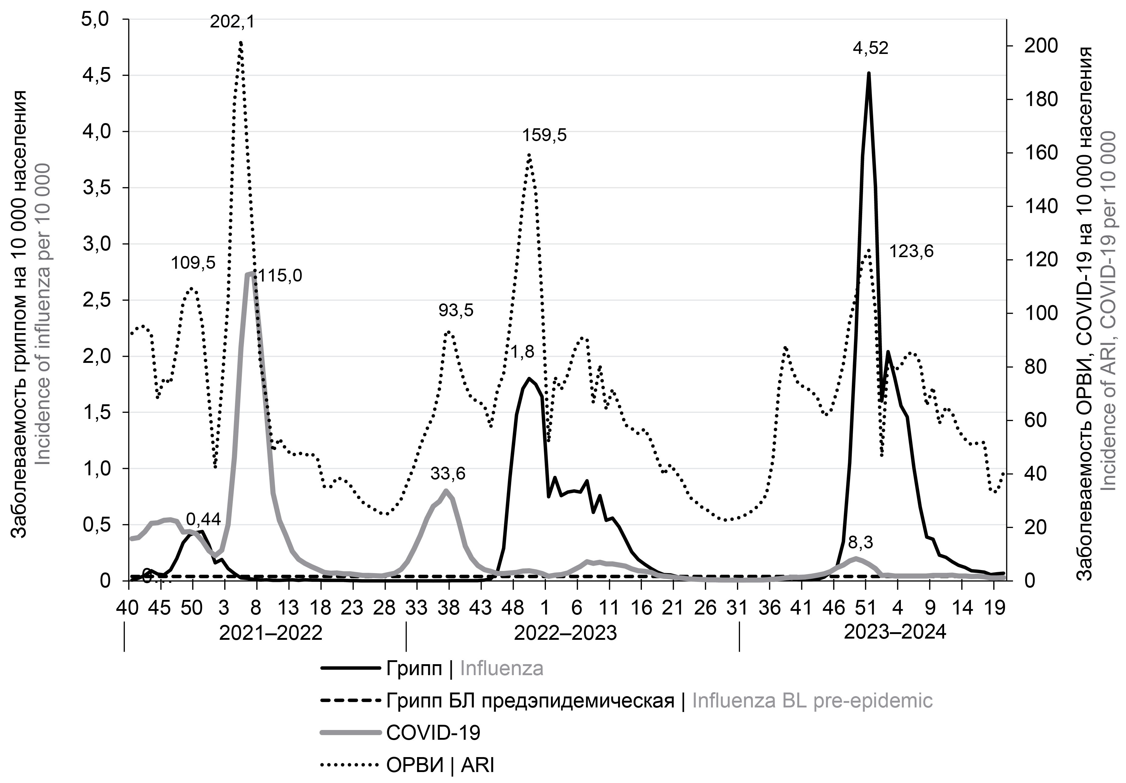 The peculiarity of the 2023–2024 influenza epidemic was an early onset (in week 45 of 2023), as in other influenza epidemics against the background of COVID-19 circulation (in 2021 — in week 45, in 2022 — in week 47). Early onset of influenza epidemics during COVID-19 circulation was also noted in Belarus; the influenza epidemic season of 2021–2022 and 2023–2024 started from week 47, and in Tashkent, the influenza epidemic season of 2023–2024 started from week 44 [7-9].