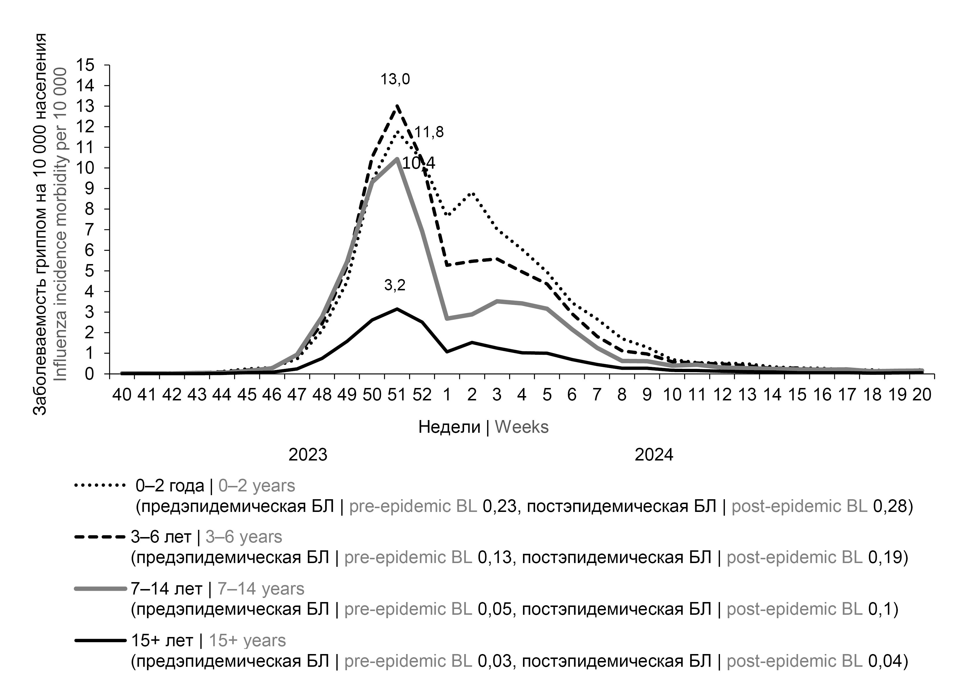 3. Fig. 2. Dynamics of influenza incidence in different age groups of the population of the surveyed cities (61) in the 2023–2024 season.
