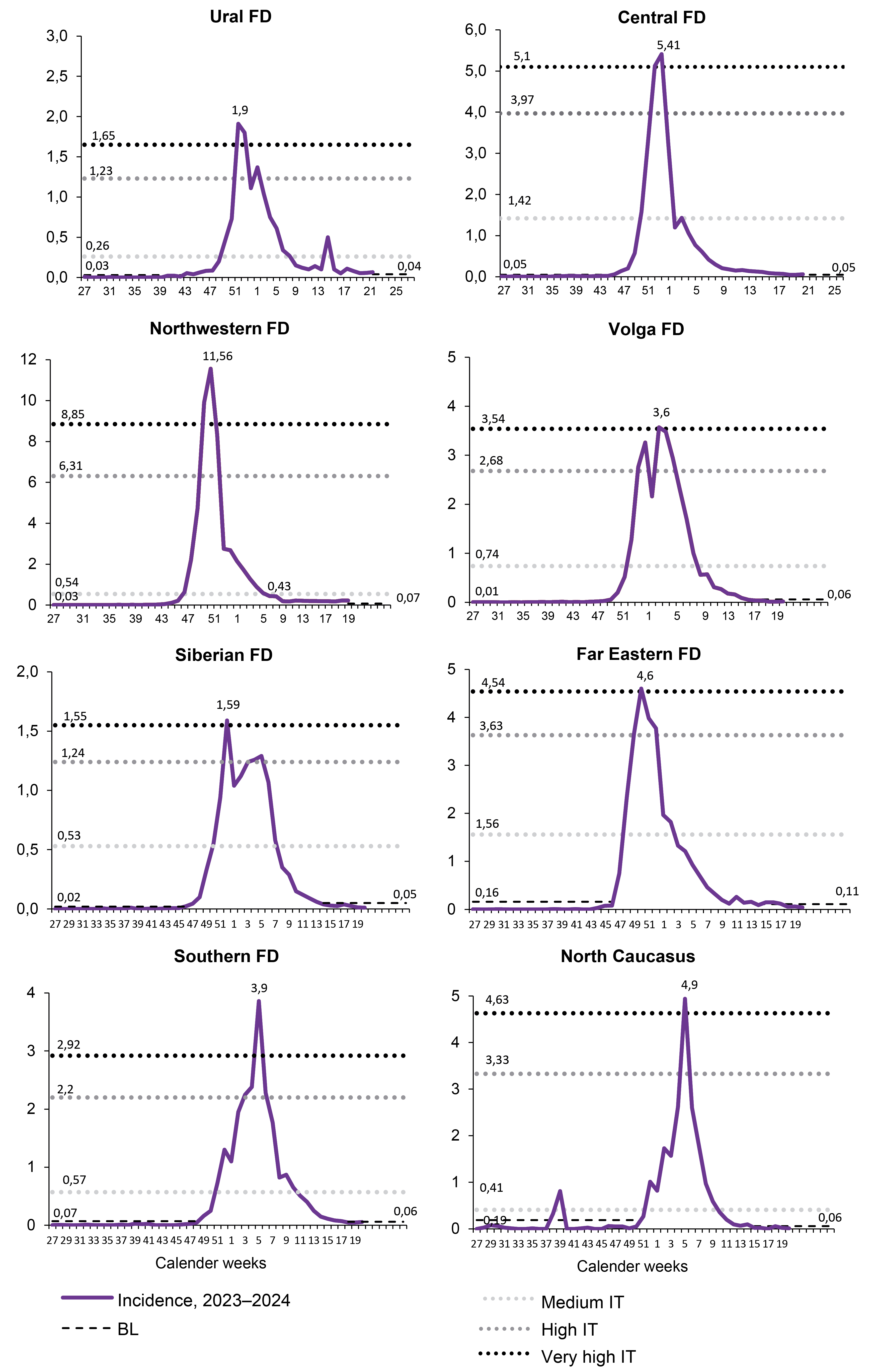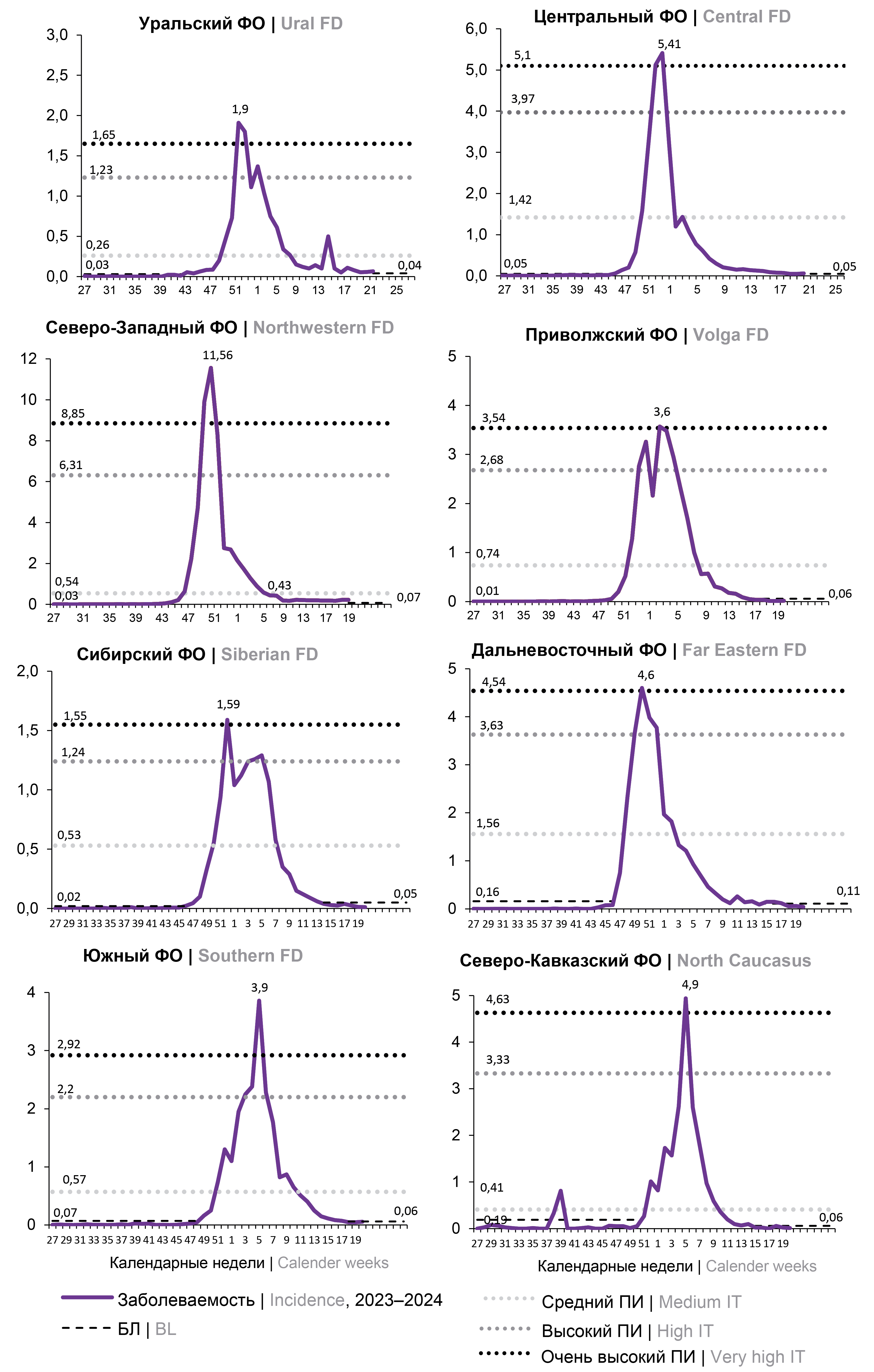 The intensity of influenza incidence at the peak of the epidemic was very high, far exceeding the threshold of this level, in the Northwestern FD (11.6 vs. 8.85 per 10,000 of the population) and Southern FD (3.9 vs. 2.92 per 10,000 of the population); in the other FDs it also reached a fairly high level but only slightly exceeded this threshold (Fig. 3).