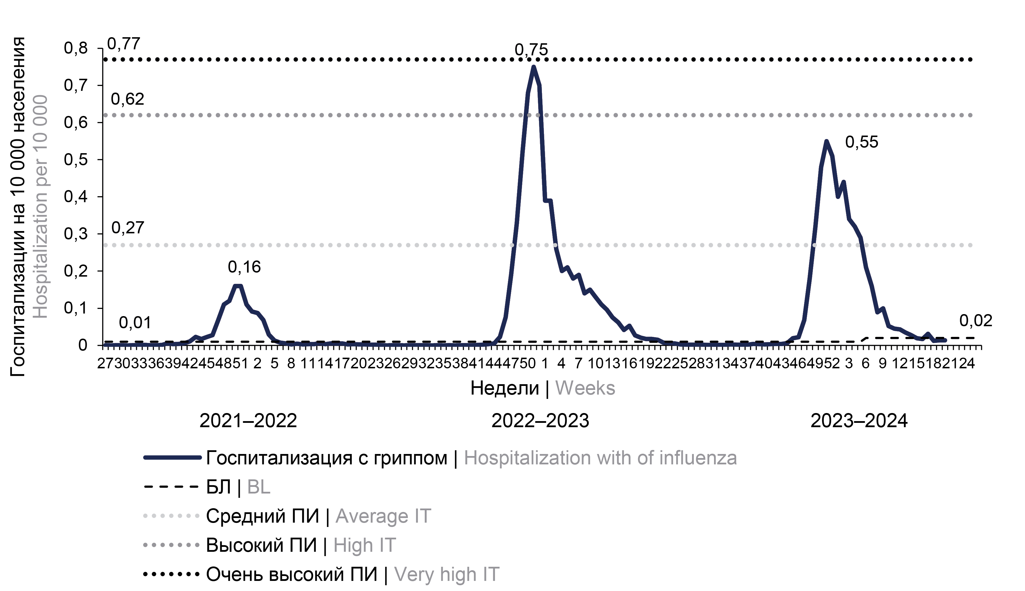 Materials and methods. At the A.A. Smorodintsev Influenza Research Institute, the software was reformed taking into account the need to solve the tasks set during the COVID-19 pandemic. Due to changes in influenza surveillance in relation to the diagnosis of “influenza”, and hence the increase in the registration of influenza cases, the baseline and threshold of epidemics were adjusted for the influenza incidence and hospitalization rates in the surveyed cities in total (61) and for each Federal districts (over the entire population and by age groups) for 3 epidemics against the background of COVID-19 pandemic (2021–2022, 2022–2023, and 2023–2024).
