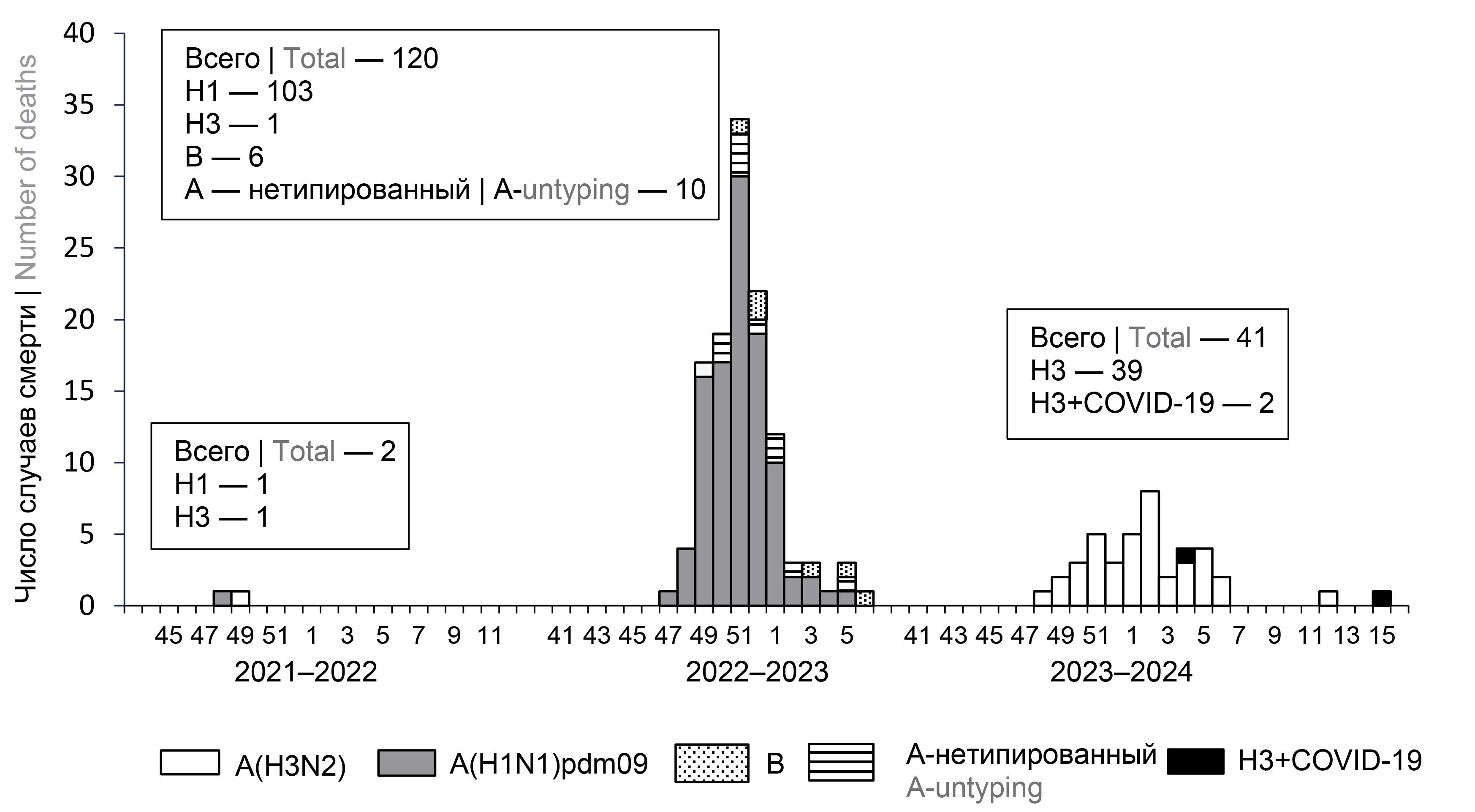 In the 2023-2024 season, 41 deaths from laboratory-confirmed influenza were reported: 39 cases of influenza A(H3N2) and 2 cases of influenza A(H3N2)+COVID-19. This season, deaths were recorded from week 47 of 2023 through week 15 of 2024 (November through April) and only from influenza A(H3N2), i.e., during its circulation period. Deaths from mixed A(H3N2) and COVID-19 infection were reported in January and April. There were no deaths from influenza B, despite its predominant circulation from March to May.