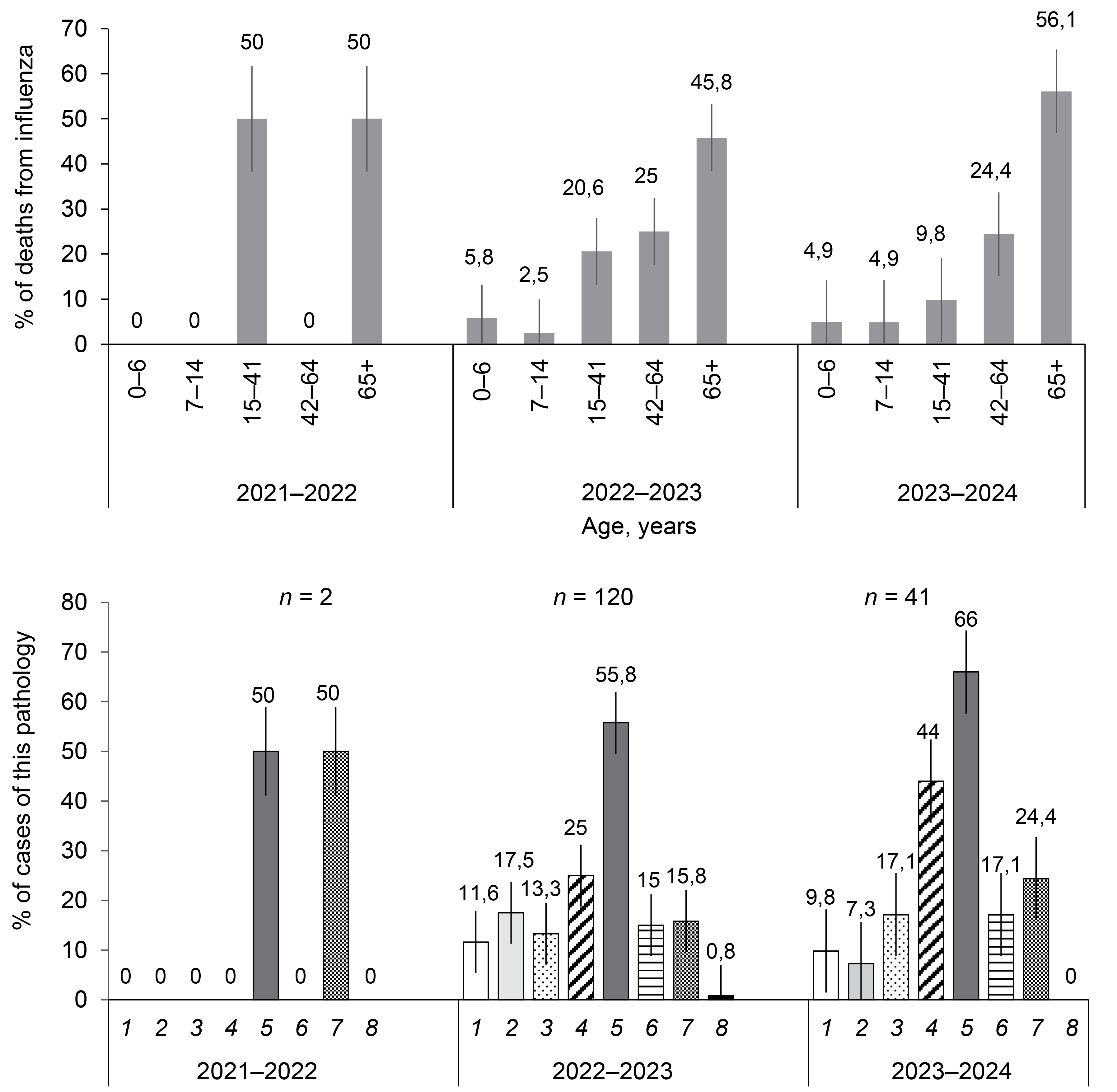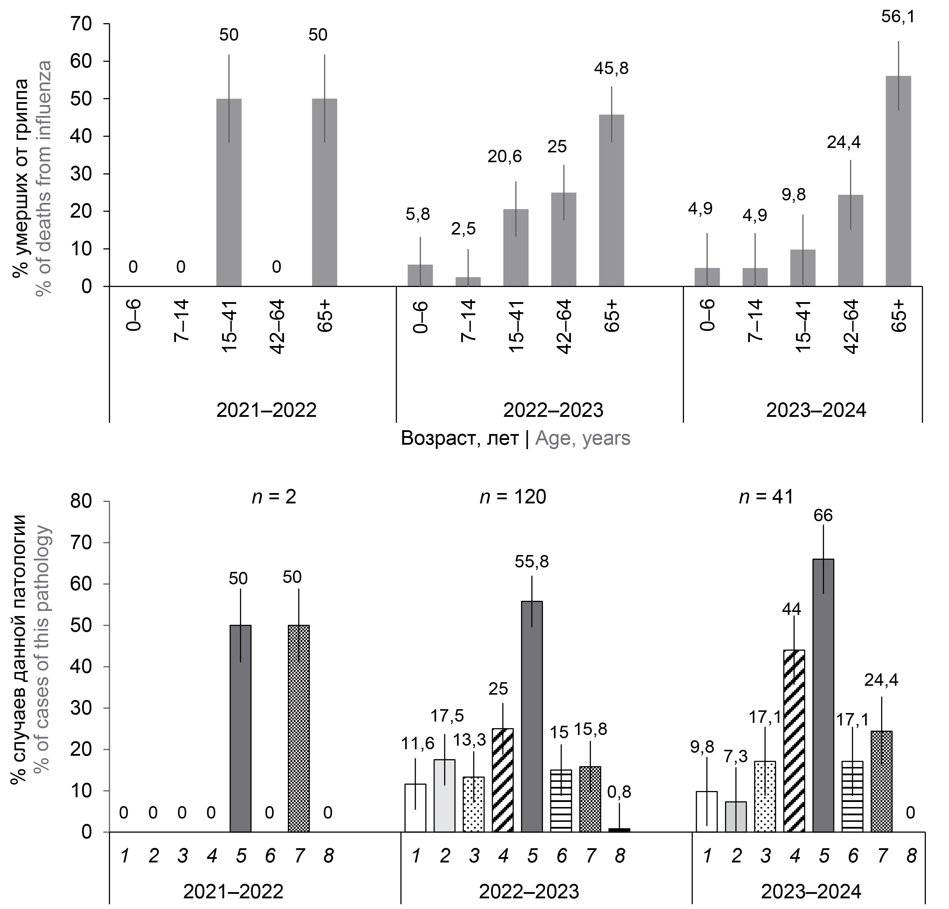 7. Fig. 6. Age structure and structure of background pathology of those who died from laboratory confirmed influenza during the epidemic in 2021–2024. 1 — obesity; 2 — diabetes; 3 — immunodeficiencies; 4 — diseases of internal organs; 5 — cardiovascular pathology; 6 — chronic lung diseases; 7 — diseases of the central nervous system; 8 — pregnancy.