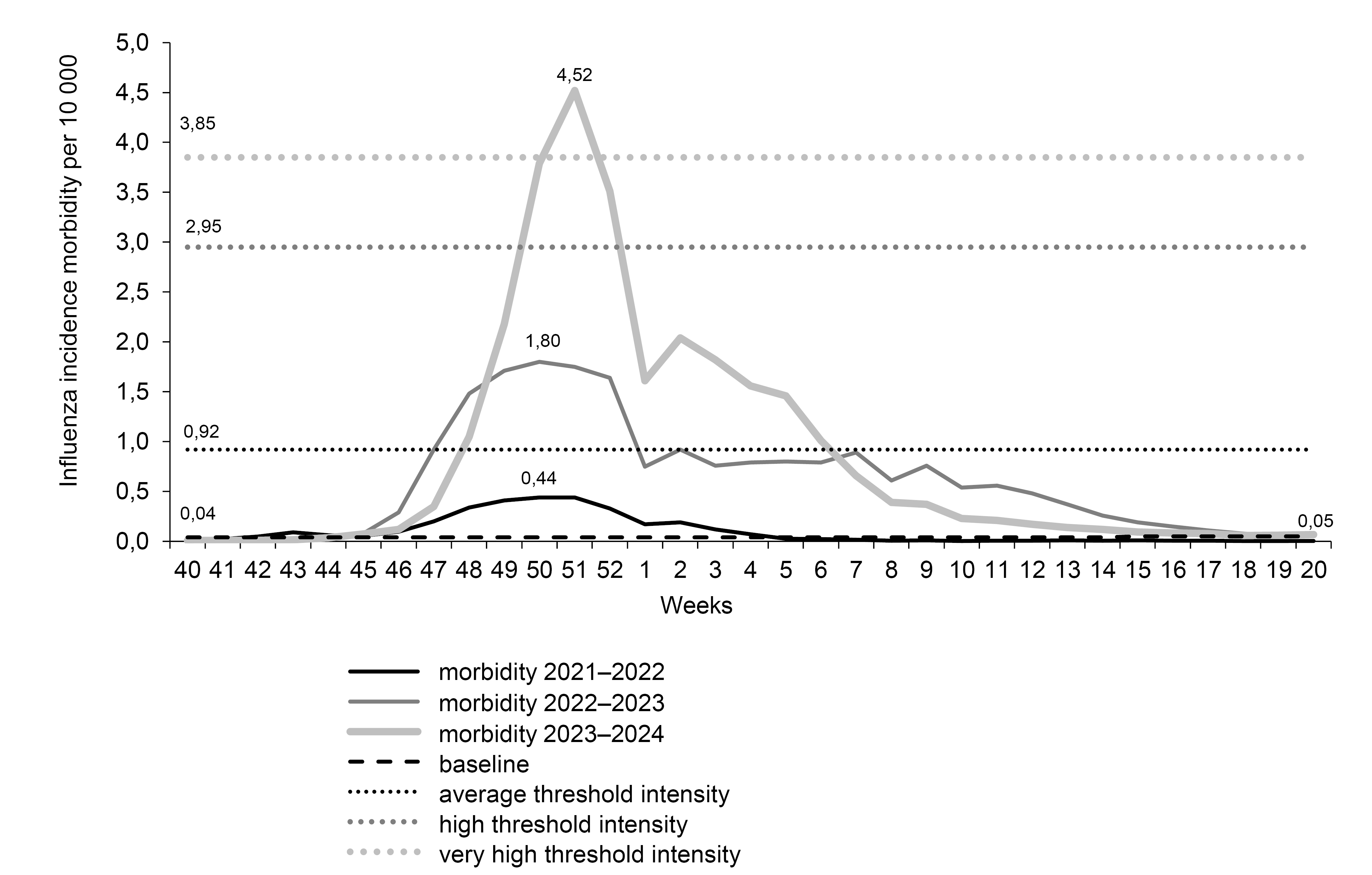 Table 1. Baselines and thresholds of influenza incidence rate, per 10,000