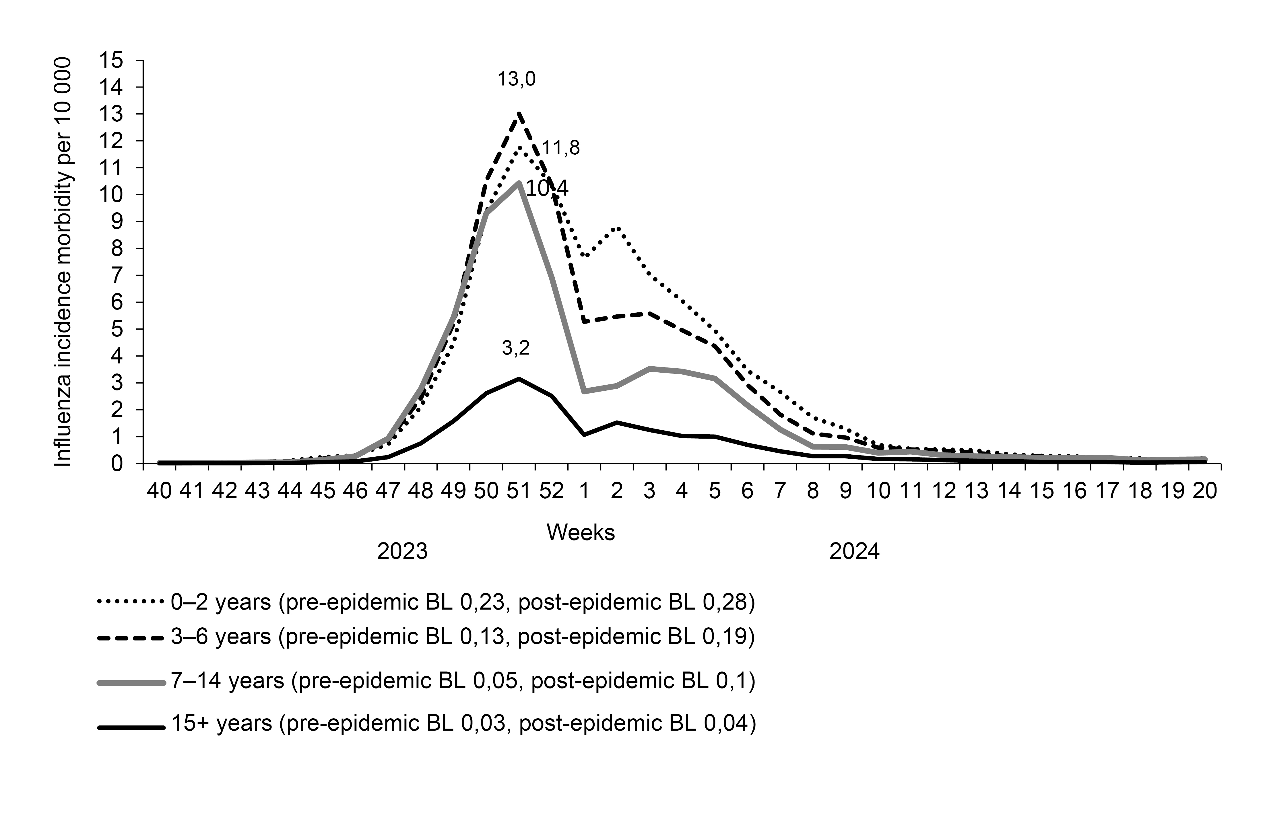In the 2023–2024 influenza season, influenza incidence exceeded the baseline in week 45 simultaneously in all age groups. Peak incidence was recorded in week 51 simultaneously in pediatric age groups and among persons over 15 years of age. The intensity of influenza incidence at the peak of the epidemic exceeded the very high intensity threshold in all age groups except children 0–2 years of age, in whom it was high. From week 52 onwards, incidence began to decline in all age groups, but remained above post-epidemic baseline in children 0–2 and 3–6 years of age until week 15 (inclusive), and among children 7–14 years of age and persons 15+ years of age until week 18.