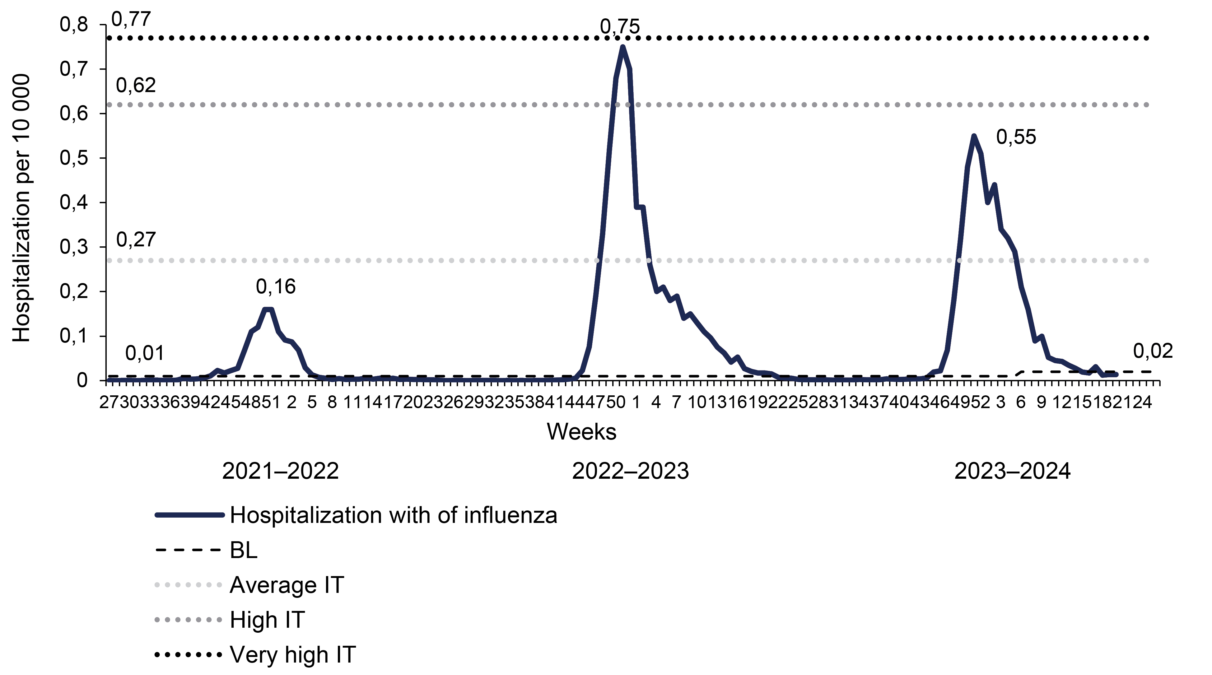 5. Fig. 4. Dynamics of the frequency of hospitalization of patients diagnosed with influenza in seasons 2021–2022, 2022–2023, and 2023–2024.