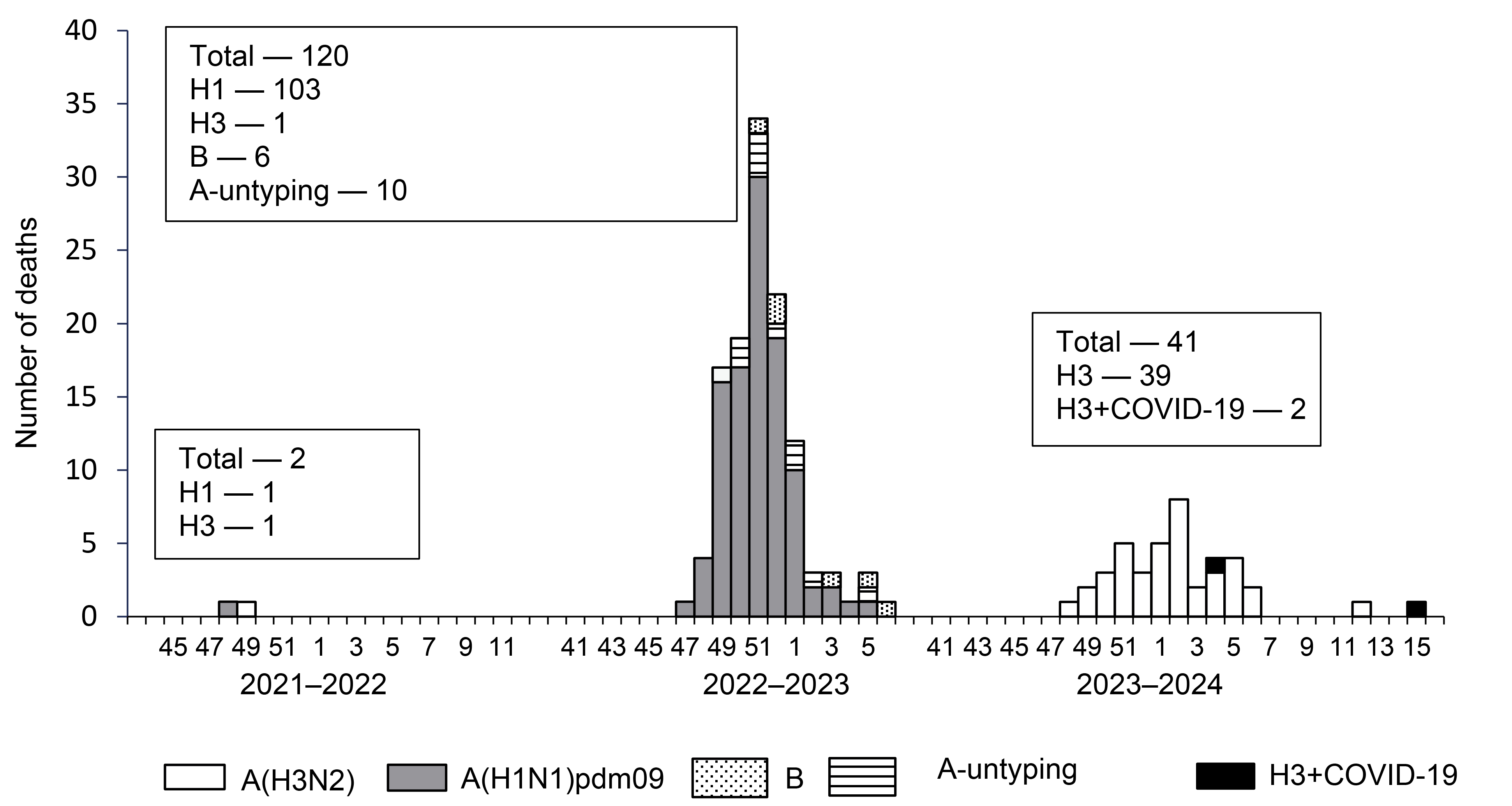 Fig. 5. The number and etiology of deaths from laboratory-confirmed influenza in the epidemic from 2021 to 2024.