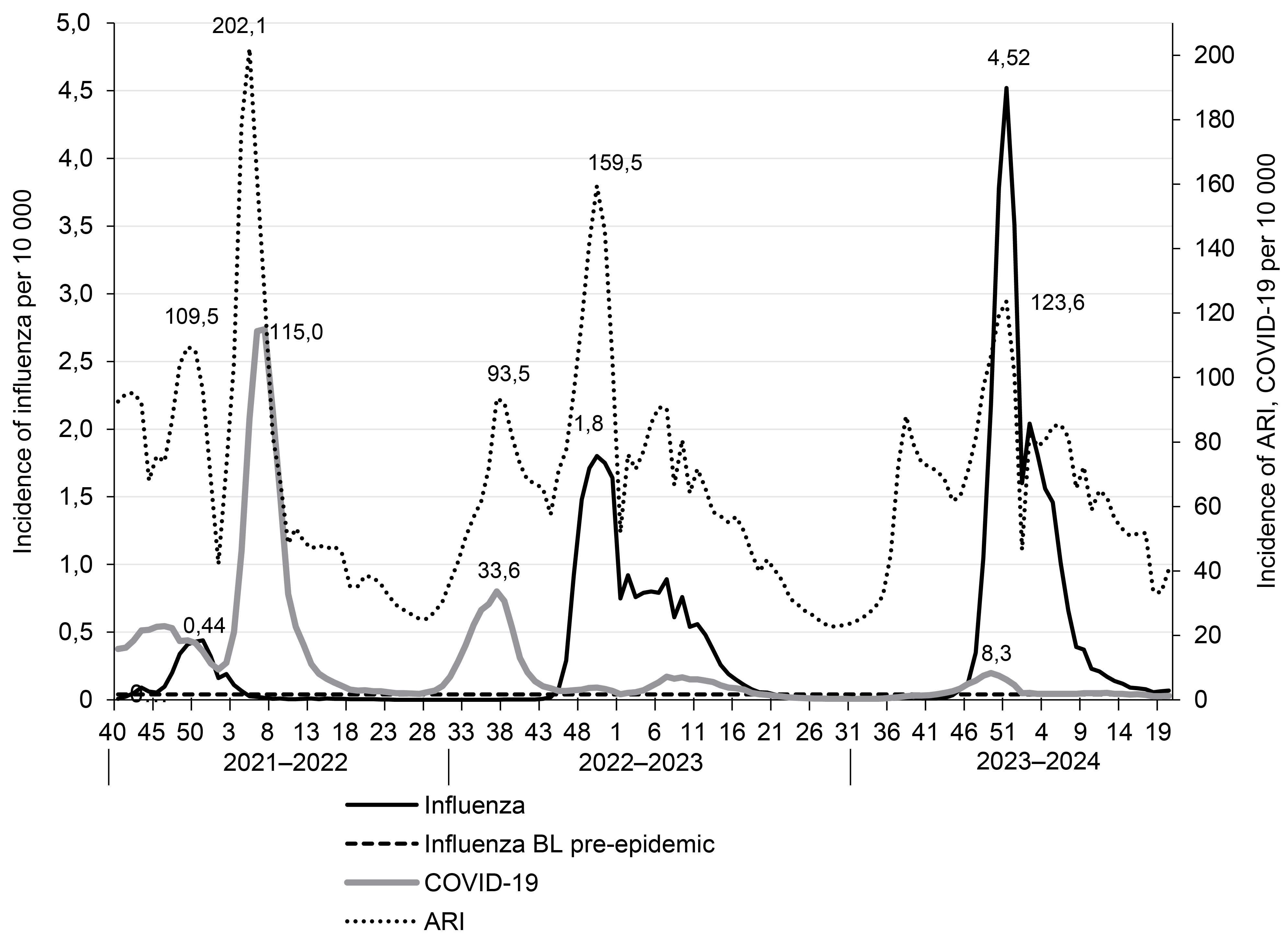 One of the reasons for the high incidence of influenza in the last epidemic may be the increase in influenza registration with increased PCR testing for influenza. The influence of interference between influenza and COVID-19 cannot be ruled out, with a decrease in COVID-19 incidence and an increase in influenza incidence in the last season.