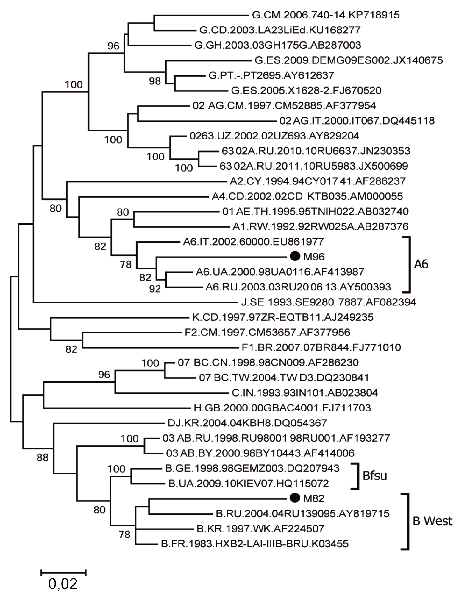 Samples from patients M82 and M96, genetically similar to Russian subtype B and sub-subtype A6 viruses, respectively, were subjected to additional phylogenetic analysis with reference sequences of HIV-1 genetic variants circulating in Russia (Fig. 2). Sample M96, in 82% of possible constructs, formed a common branch with the sub-subtype A6 AF413987 and AY500393 reference sequences. Sample M82, in turn, with 78% reliability formed a common branch with the Russian reference Bwest AY819715 and the main world reference of the same lineage HXB-2 K03455.