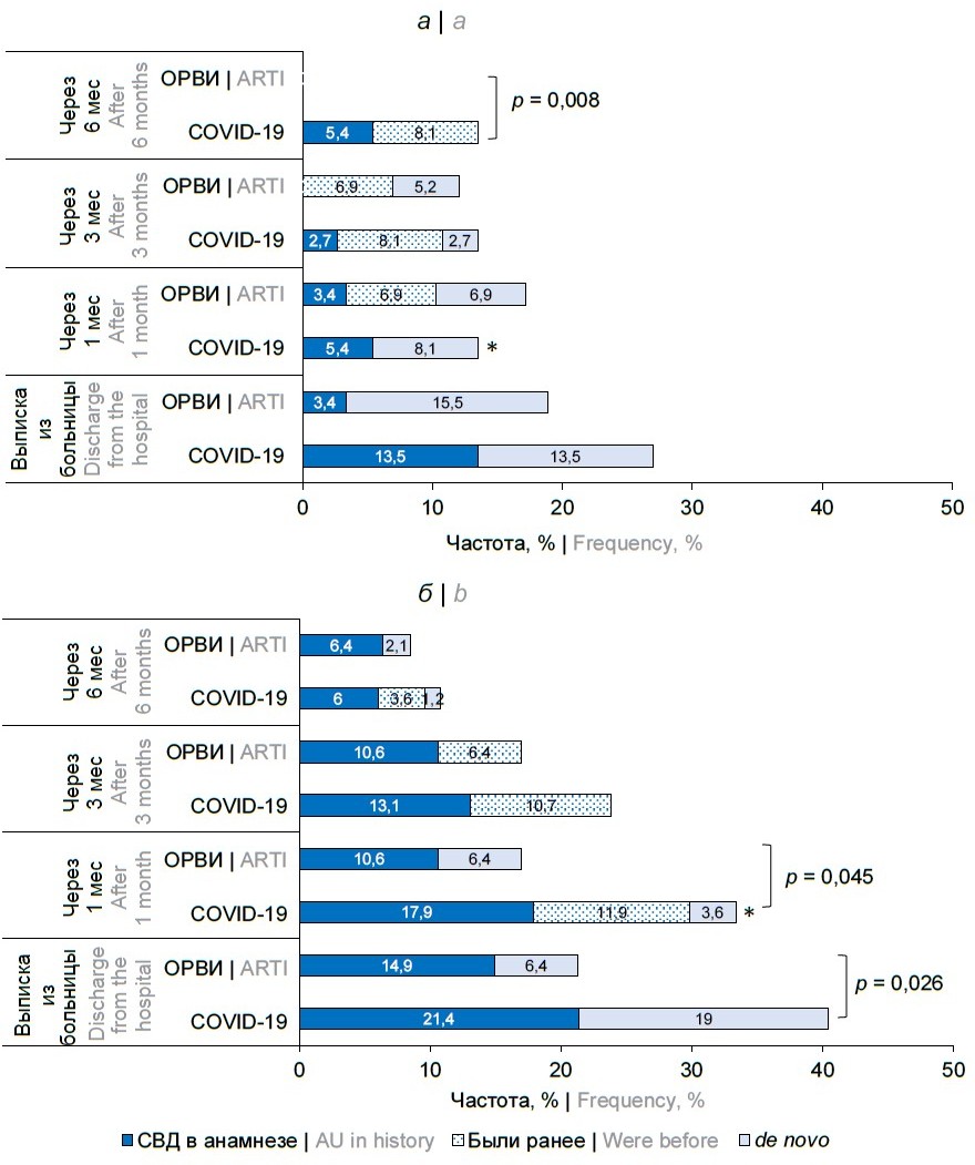 Sleep disorders, restless sleep de novo in relation to the previous time point, n (%) | COVID-19 ARTI | 5 (13.5) 1 (1.7) р1 = 0.032 | 1 (2.7) 1 (1.7) | 2 (5.4) 1 (1.7) | – 1 (1.7) | – – | – – |