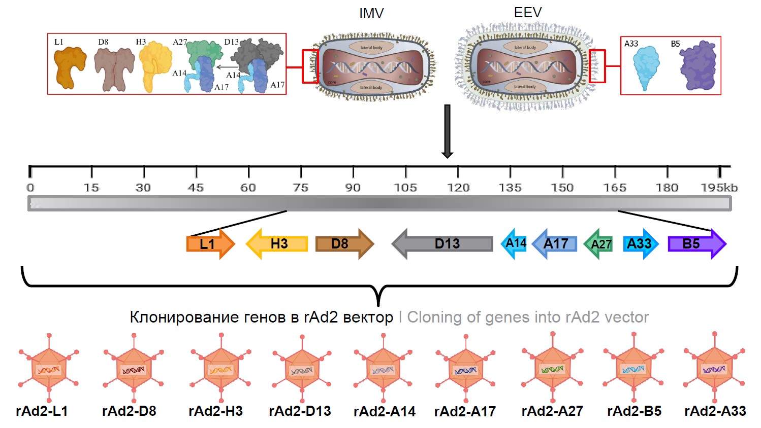 Materials and methods . Recombinant human adenoviruses type 2 (rAd2) carrying surface antigens of vaccinia virus were obtained using homologous recombination in bacteria, followed by adenoviral particle assembly in HEK293 cells. The immunogenic and protective properties of these adenoviruses were tested in BALB/c mice. The presence of antibodies to the vaccinia virus was assessed using ELISA, and survival rates were evaluated in a lethal infection model after intranasal challenge with the vaccinia virus strain Western Reserve.