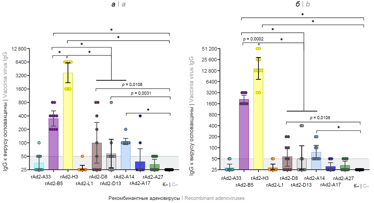 3. Fig. 2. Immunogenicity of recombinant adenoviruses expressing surface antigens of the vaccinia virus after single (a) and double (b) intramuscular immunization. The figures show the confidence at p < 0.05; *p < 0.0001. C — control.