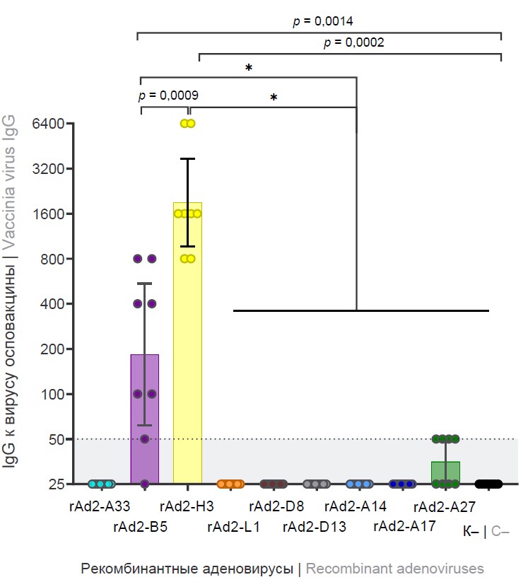4. Fig. 3. Immunogenicity of recombinant adenoviruses expressing surface antigens of the vaccinia virus after two intranasal immunizations. The figure shows the confidence at p < 0.05; *p < 0.0001. C– — control.