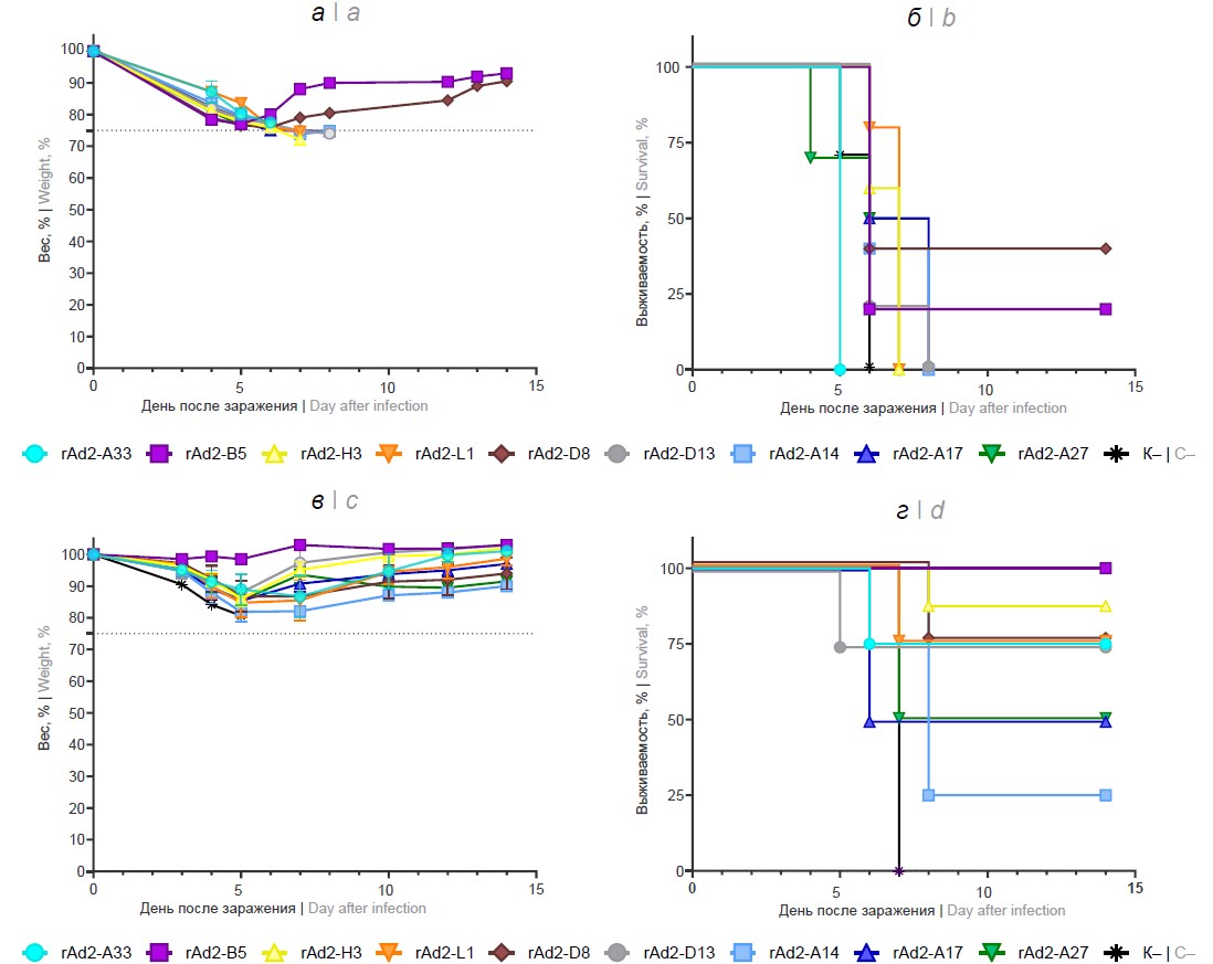 5. Fig. 4. The protective efficacy of recombinant adenovirus vectors expressing the surface antigens of the vaccinia virus after intramuscular (a, b) or intranasal (c, d) immunization in a mouse model of lethal infection. a, c — weight dynamics (the graph shows the average value and the standard error of the average value); b, d — survival. C– — control.