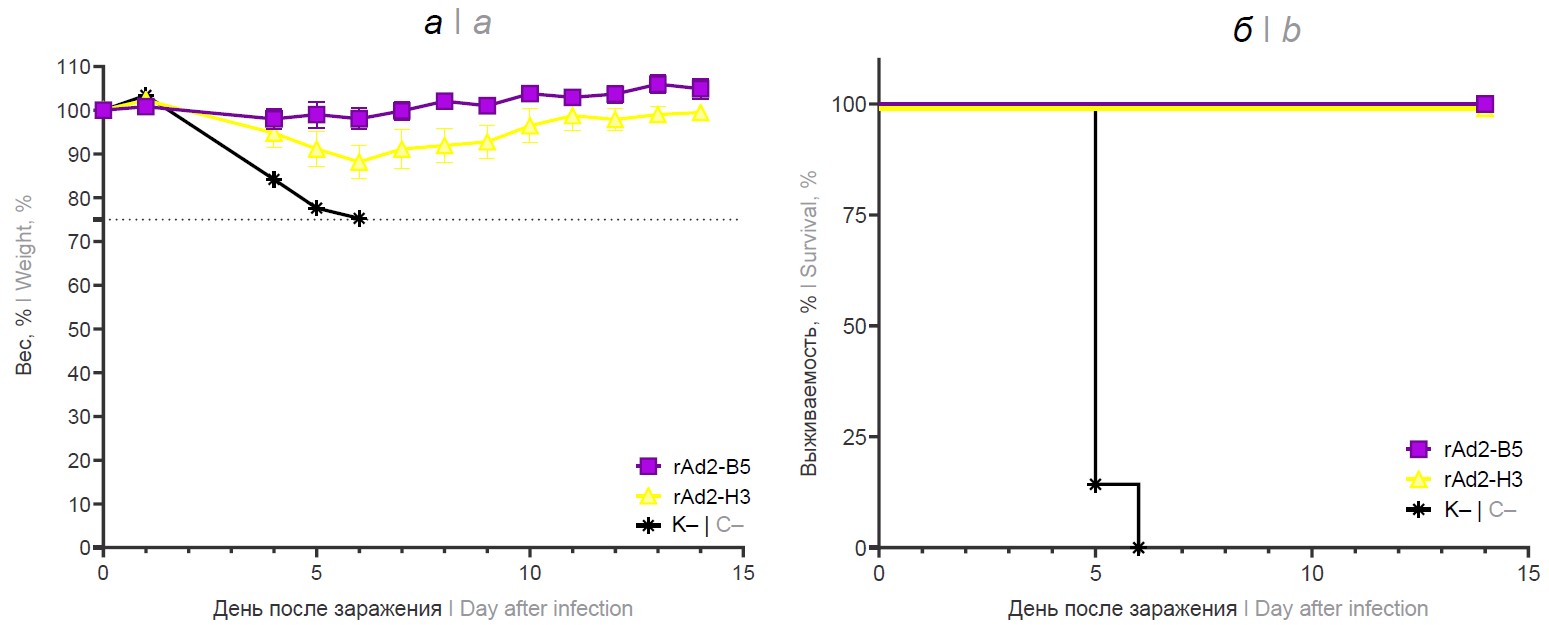 6. Fig. 5. The protective efficacy of recombinant adenovirus vectors rAd2-B5 and rAd2-H3 after combined immunization (im+in) in a mouse model of lethal infection. a — weight dynamics; b — survival. C — control.