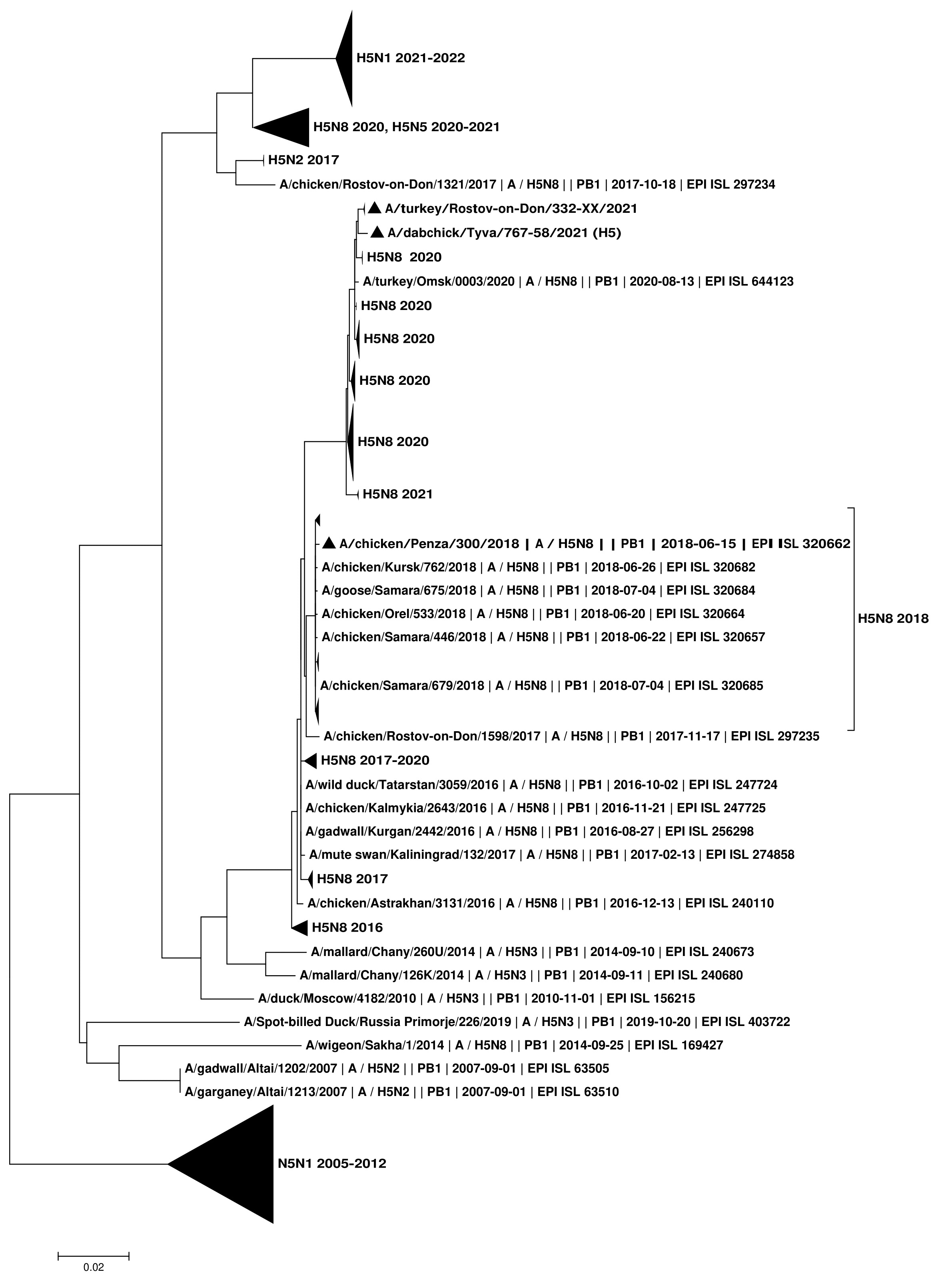 A 678N mutation was detected in the PB1 protein of HPAI isolated in industrial farming in Rostov region — A/turkey/Rostov-on-Don/332-XX/2021; A/dabchick/Tyva/767-58/2021 virus with 678G mutation was detected in the territory of the Republic of Tyva. According to experimental data, the combination of amino acids 13P and 678N causes a sharp increase in the polymerase activity of HPAI during replication in mammalian cells [19]. In the A/chicken/Penza/300/2018 isolate, a 105S mutation was detected that increases the manifestation of virulent properties against mice. To verify the origin of these mutations, phylogenetic analysis was performed, which showed that the A/turkey/Rostov-on-Don/332-08/2021, A/dabchick/Tyva/767-58/2021 and A/chicken/Penza/300/2018 viruses are in groups that include viruses that spread in Russia between 2018 and 2022 and did not have similar mutations (Figure). Phylogenetic analysis confirms that the occurrence of mutations 105S, 678N, 678G in the PB1 protein among HPAI detected in Russia is the result of antigenic drift rather than antigenic shifting.
