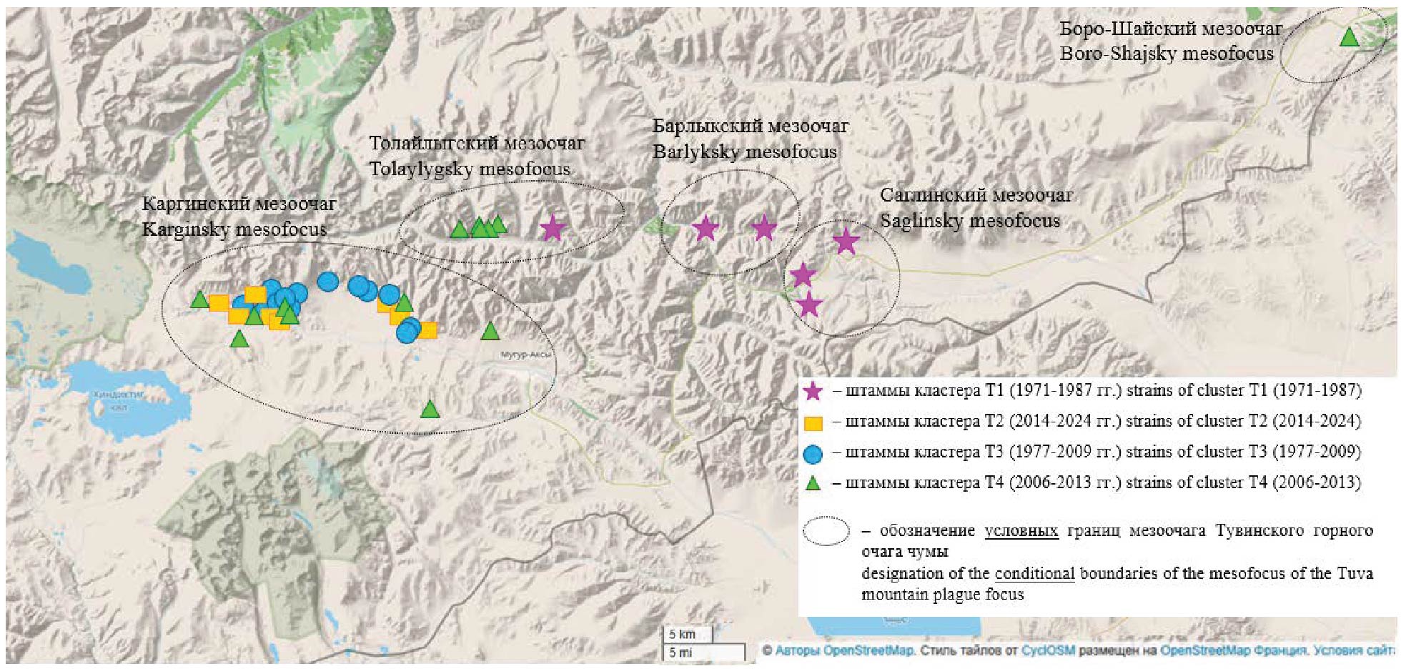 Results. According to SNP-analysis of Y. pestis strains of lineage 4.ANT from the TMPF, the presence of 4 phylogeographic groups was established: T1 (Saglinsky, Tolaylyg and Barlyk mesofoci, 1971–1987), T2 (Karginsky mesofocus, 2014–2024), T3 (Karginsky mesofocus, 1977–2009), T4 (Karginsky, Tolaylyg and Boro-Shai mesofoci, 2006–2013). Eight MLVA-genotypes of strains of 4.ANT lineage from Tuva and variable VNTR loci were identified: yp1290ms04, yp1935ms05, yp0559ms15, yp4042ms35, yp4425ms38, yp1108ms45, yp4280ms62, yp1580ms70.