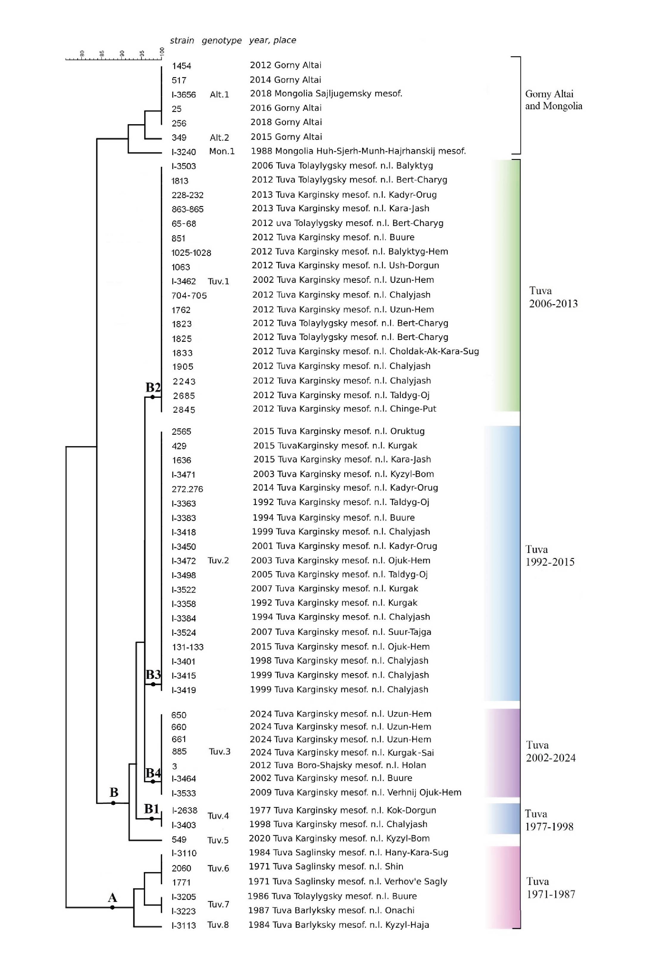 Discussion. Among the strains analyzed, the earliest representatives of the 4.ANT branch are strains of the T1 cluster from the TMPF. The population of strains from the Altai Mountains and Mongolia and the population of strains from the TMPF (1977–2024) are represented as separate sub-branches on the tree. The latter population is represented by polytomy and is characterized by pronounced clustering according to the spatial and temporal principle.