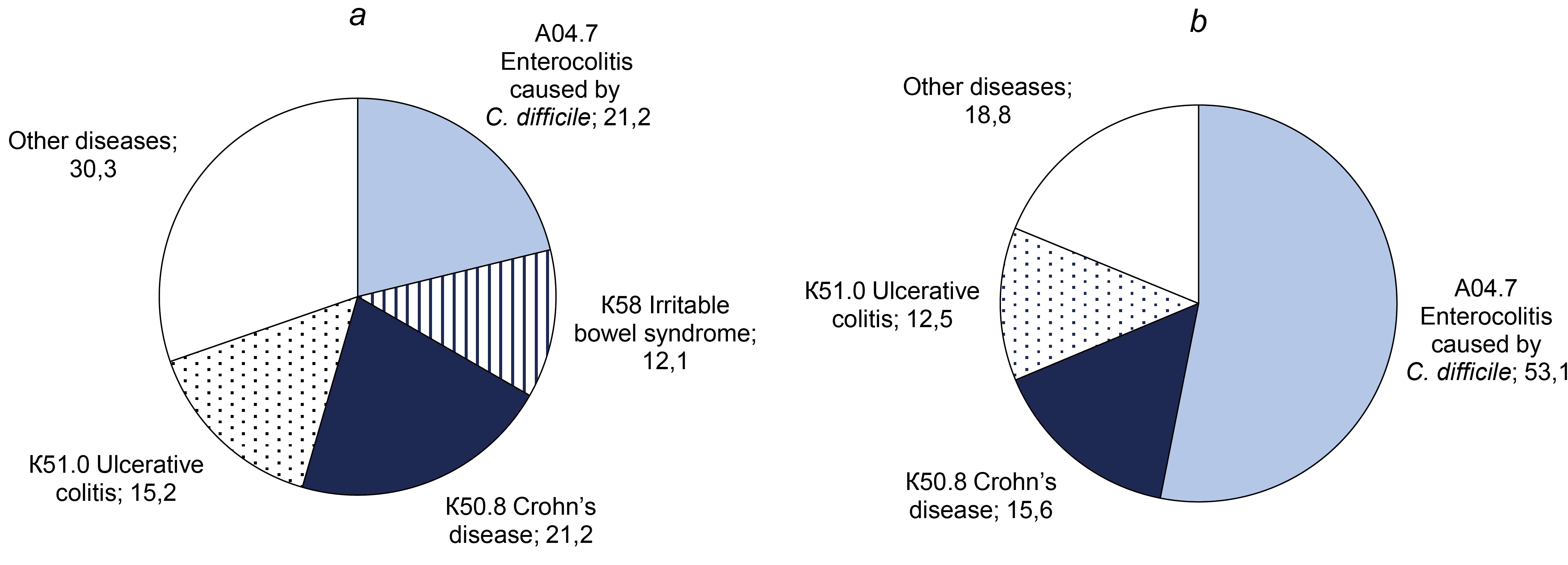The aim of the study is to investigate the frequency of detecting C. difficile (both toxigenic and non-toxigenic strains) in patients admitted to the gastroenterology department of the Yu.M. Lopukhin Federal Scientific Clinical Center for Physical and Chemical Medicine of the Federal Medical Biological Agency of Russia in 2021–2023 with diarrhea syndrome and other established diagnoses.