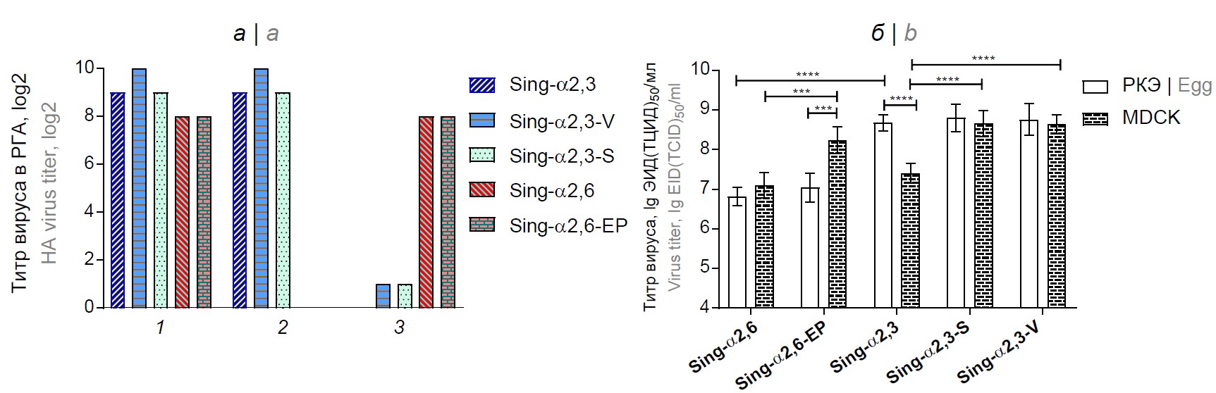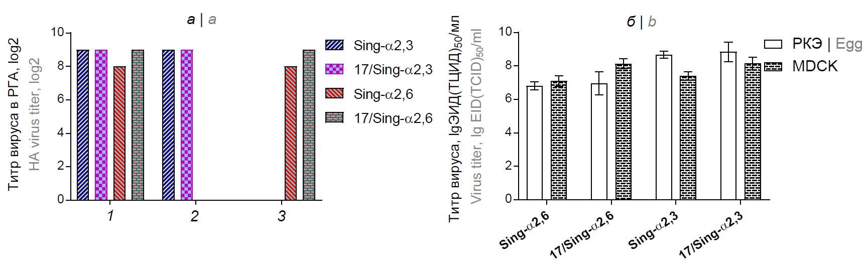 To confirm this hypothesis, we constructed two LAIV strains H2N2 subtype based on the attenuation donor A/Leningrad/134/17/57: A/17/Singapore/57/1 with HA and NA genes from Sing-α2,3 virus (designated as 17/Sing-α2,3) and A/17/Singapore/57/2 with HA and NA genes from Sing-α2,6 virus (17/Sing-α2,6) by reverse genetics methods. HA assay with different RBC confirmed the receptor specificity of the resulting vaccine viruses, which matched that of the corresponding wild-type virus (Fig. 4, a), further indicating the key role of hemagglutinin in binding to host cell glycan receptors. Importantly, adaptation of the vaccine strains to MDCK cells did not result in new mutations in the HA molecule: more than 50 viruses isolated from the plaques matched to the original strain of LAIV. Evaluation of the infectious activity of the engineered viruses showed that the vaccine strains 17/Sing-α2,3 and 17/Sing-α2,6 multiplied equally well in MDCK cells, whereas in eggs, the 17/Sing-α2,3 virus had an infectious titer an order higher than that of the 17/Sing-α2,6 virus (Fig. 4, b).
