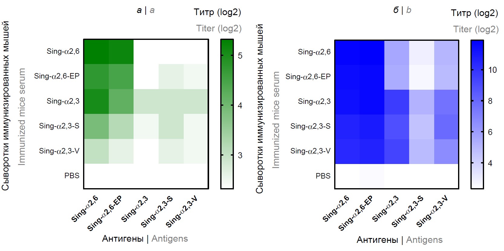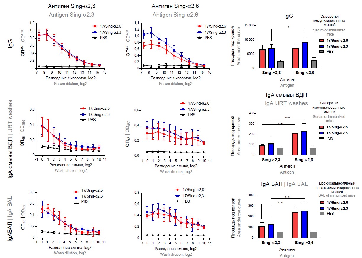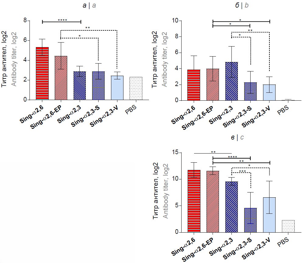 Twofold immunization of Syrian hamsters with reverse-genetic vaccine strains 17/Sing-α2,3 and 17/Sing-α2,6 resulted in similar levels of serum IgG antibodies, binding to the Sing-α2,3 antigen, with the 17/Sing-α2,3 vaccine virus inducing significantly more antibodies to the Sing-α2,6 antigen than to its own Sing-α2,3 antigen (Fig. 5). The results obtained are in full compliance with the results of studying the antigenicity of pandemic variants of A/Singapore/1/57 in an experiment on mice (Fig. 3).