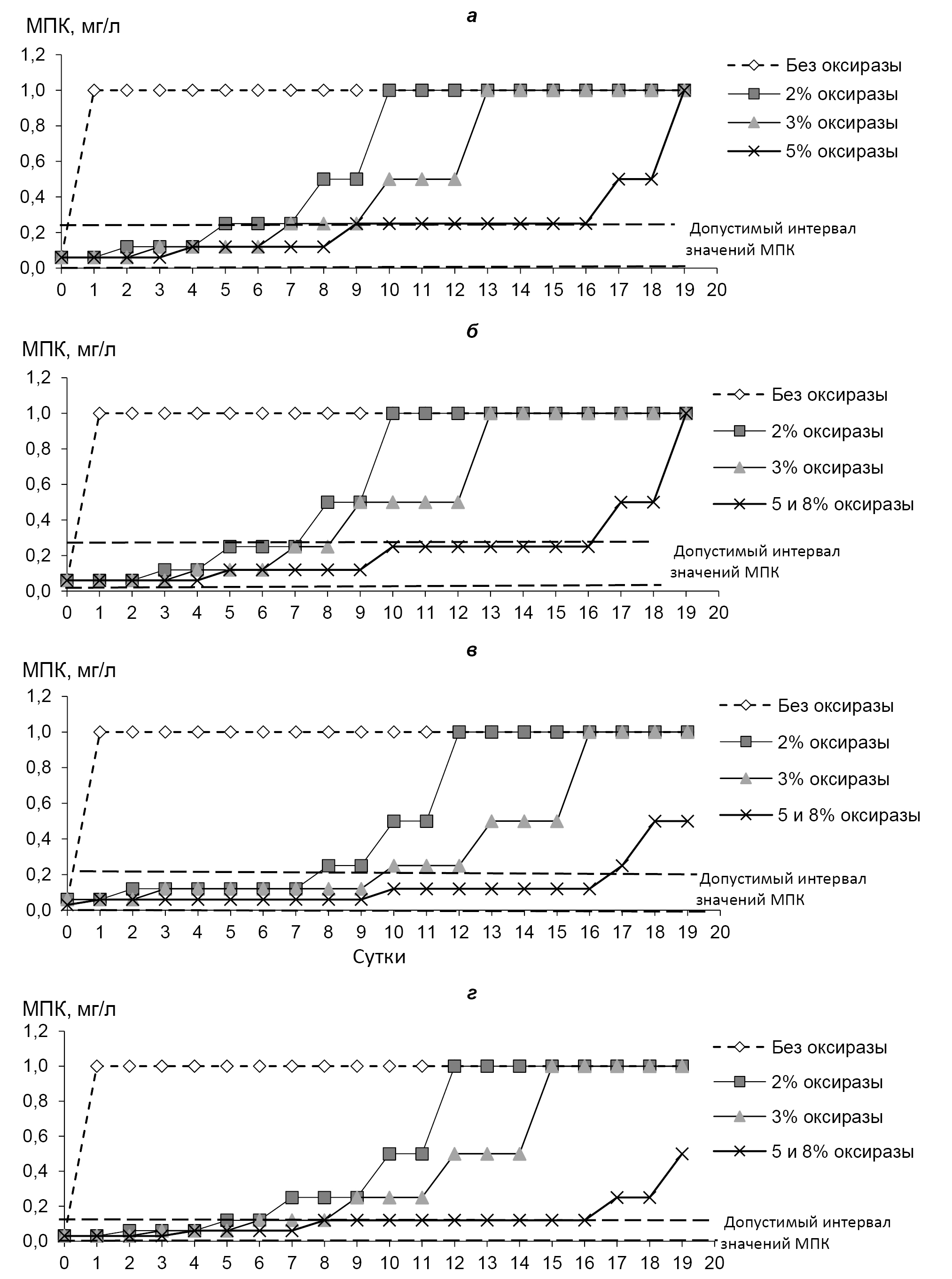 Зависимость значений МПК тигециклина для E. coli ATCC 25922 (а), S. aureus ATCC 29213 (б), E. faecalis ATCC 29212 (в) и S. pneumoniae ATCC 49619 (г) от концентрации оксиразы, добавленной в базовые растворы антибиотика, и сроков их хранения при 2–6°С.